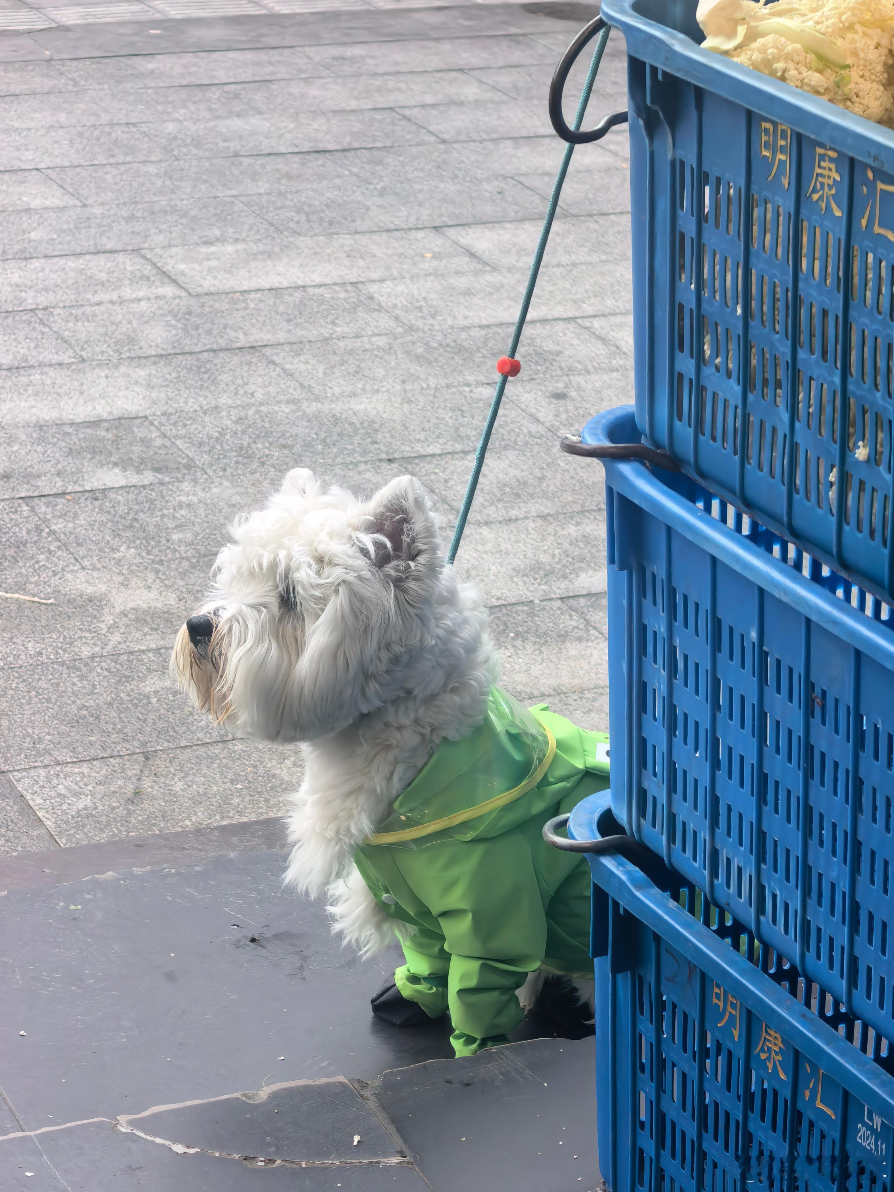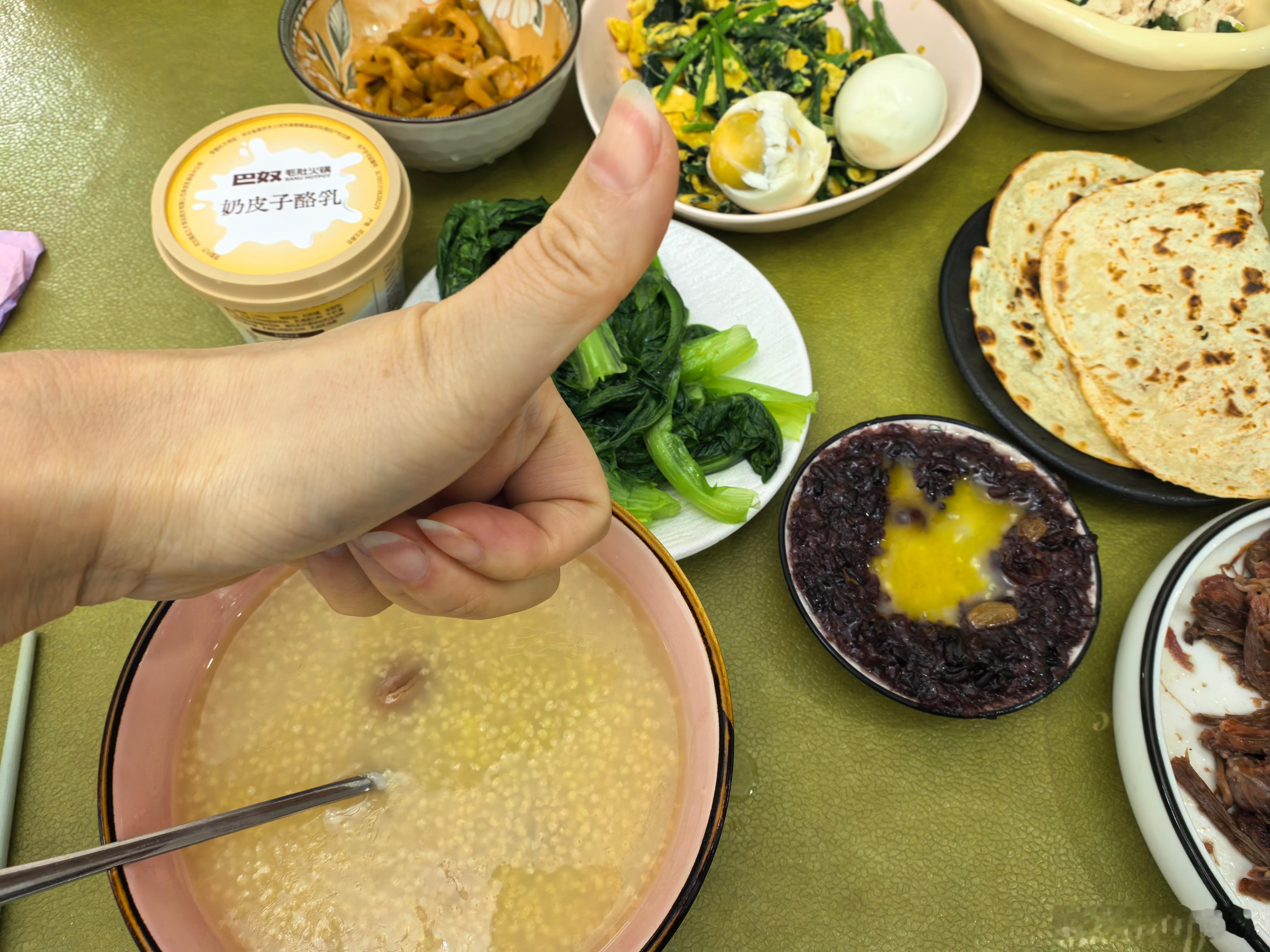 当我买菜的时候,有财就乖乖在门口等我今天吃小米粥+青菜+菠菜炒蛋+手抓饼猜猜右下