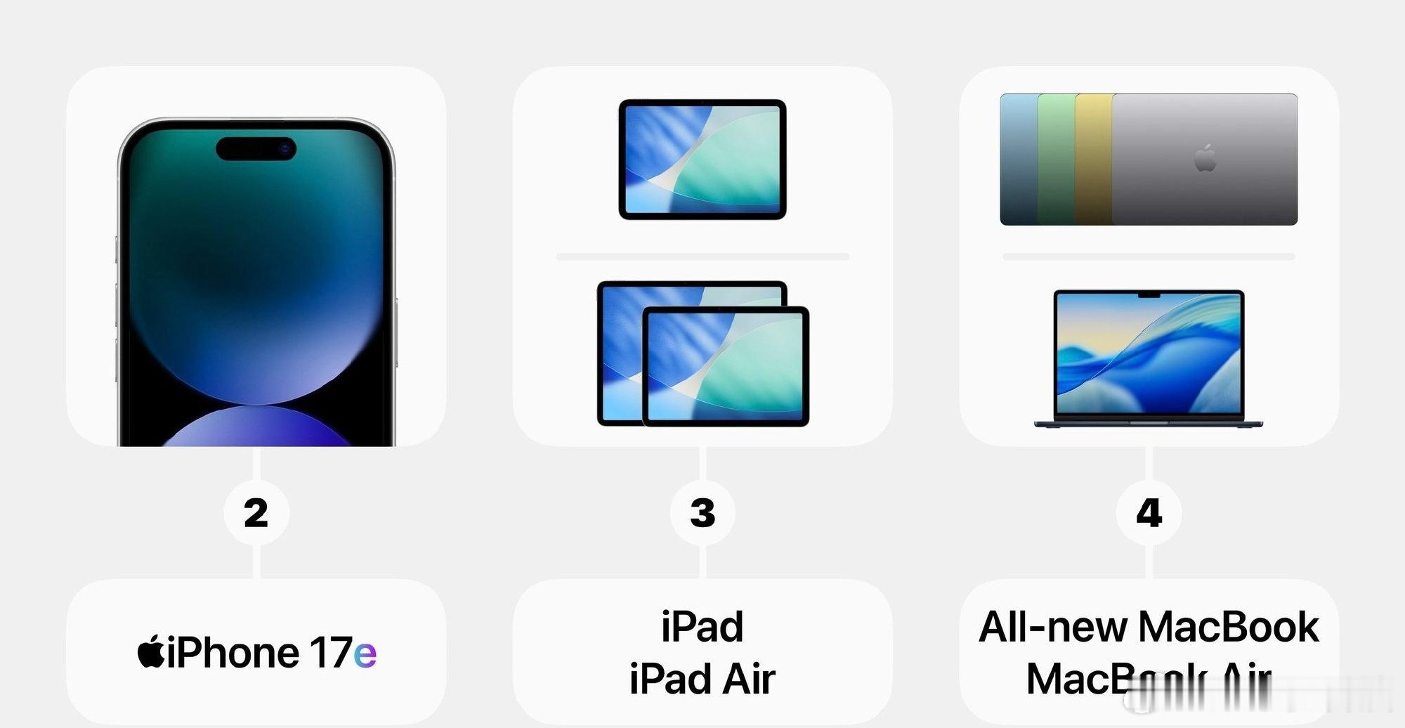 苹果新品来了 有料的产品不少,即将要和大家见面的有iPhone 17e、低价版的MacBook、正常迭代的iPad系列以及MacBook Pro,这次是3月2日到4日分阶段发布新品,和之前苹果发布新品的形式不太一样,也算是发布策略创新了,话说你最期待哪款新品?
