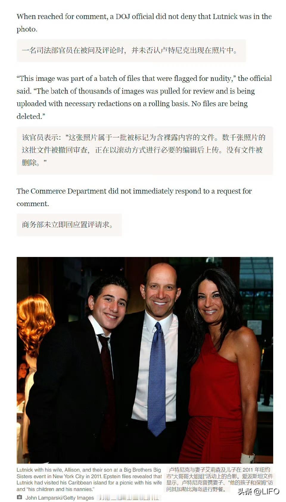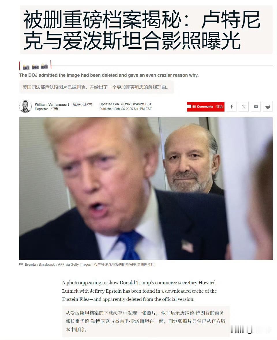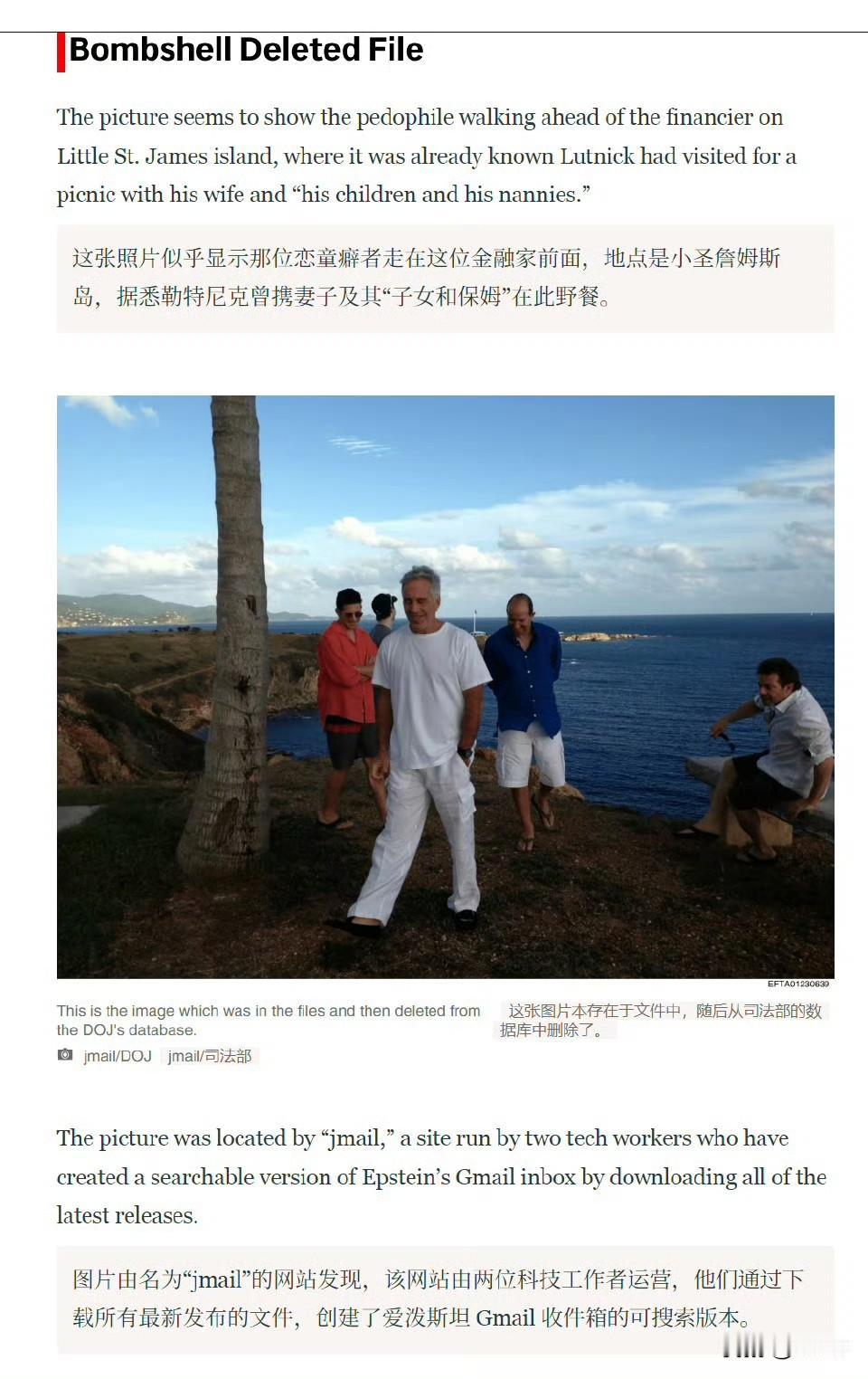美国媒体《每日野兽》等报道:爱泼斯坦文件档案库(标记为 EFTA01230639)中出现了美国商务部长卢特尼克(蓝衬衫)与爱泼斯坦(前方白衣者)同在爱泼斯坦岛上的照片。图片由名为“jmail”的网站发现,该网站由两位科技工作者运营,他们通过下载所有最新发布的文件,创建了爱泼斯坦 Gmail 收件箱的可搜索版本。该小组在其“jmail 档案”中发布了指向该图片的链接,该图片显示了一个美国司法部的文件名。该文件名 EFTA01230639 与司法部爱泼斯坦网站上的任何结果均不匹配,表明它已被美国司法部删除。64 岁的卢特尼克此前已被发现就他与爱泼斯坦的接触撒了谎。这位商务部长在亲特朗普的播客采访中声称,他只在 2005 年见过爱泼斯坦一次,当时他和妻子搬到了爱泼斯坦隔壁。他声称自那年起就断绝了所有联系。但司法部公布的文件显示,在爱泼斯坦 2008 年对招揽未成年人认罪后多年,卢特尼克与爱泼斯坦仍有电子邮件往来。其中一些信息是为了安排电话和午餐——包括上岛。