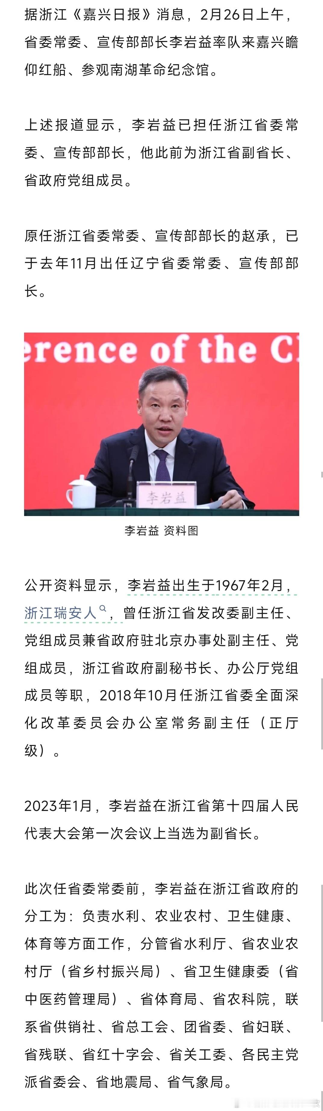 李岩益已任浙江省委常委、宣传部部长。