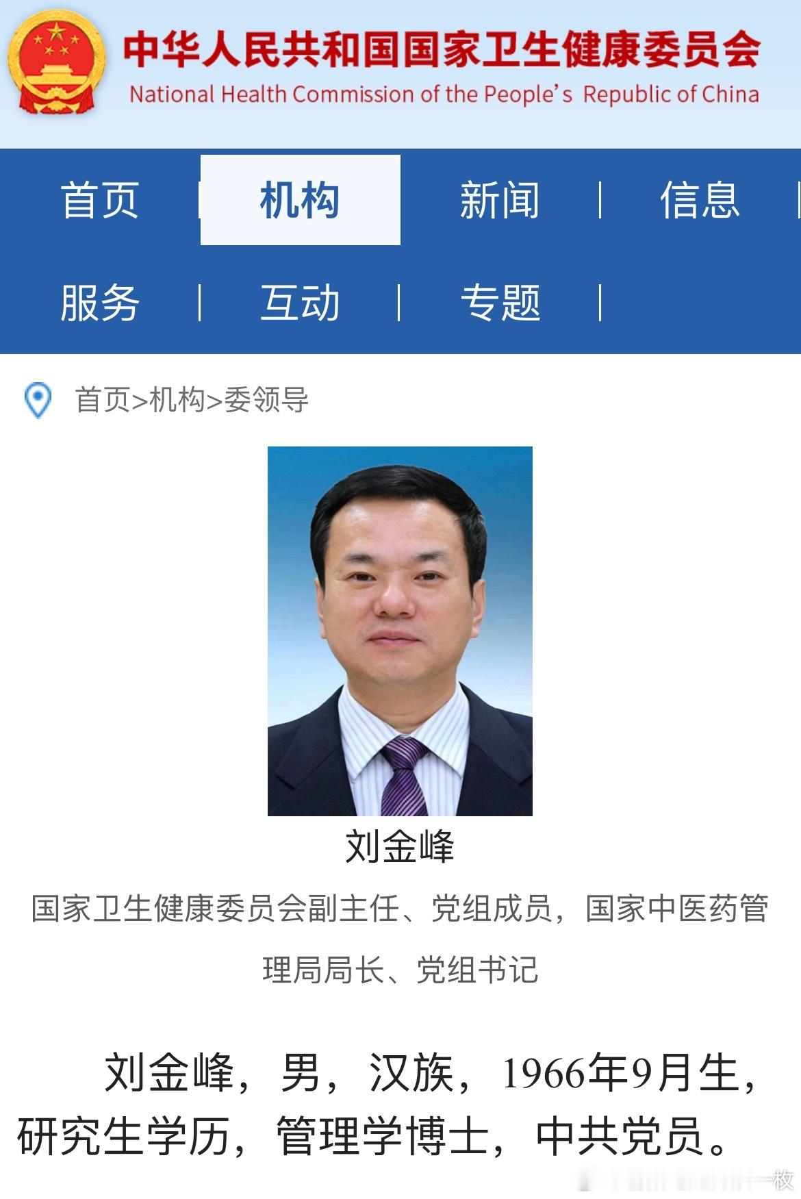 国家卫健委副主任、党组成员刘金峰,已同时担任国家中医药管理局局长、党组书记。