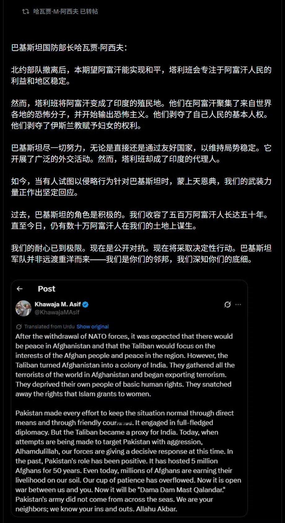 巴基斯坦国防部长称: “阿富汗变成了印度的殖民地”。“我们的耐心已经耗尽。现在,我们与你之间将是一场全面战争。”巴基斯坦对阿富汗政府公开宣战热点观点海外新鲜事