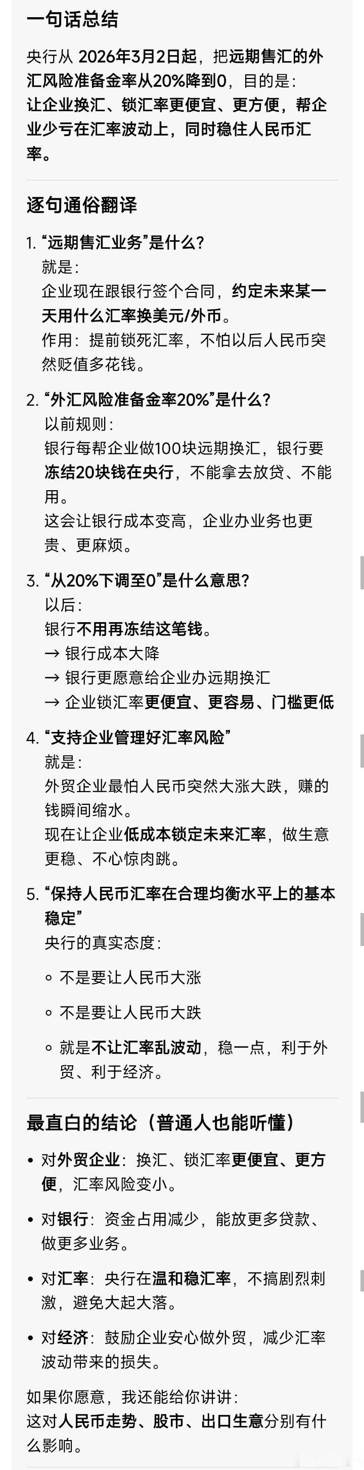央行出手了,直接降到零。人民币涨到6.84,央行看不下去了。3月2号开始,远期售