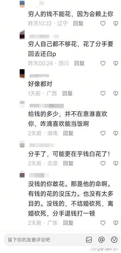 谈恋爱不敢收,不敢花男人的钱是真怕被要,还要被骂[晕] 所以我们姐妹谈恋爱都没花人家多少钱!都是自己挣钱自己花!也就婚后我在家带娃才花他的钱,不过还好,我前任谈的时候也是挺好的一个人,还给我买了金项链,我不戴,他说看周围人家女的都有,我啥都没有,就给我买了,他人挺好,散伙是因为他要回他老家,我不想去他老家,我还他金项链,他走的时候又偷偷放我包里了! 看评论区这人遇到的啥奇葩!!!现实中这样的人也特别多!!!一提钱就翻脸!呵呵,还是不要轻易花男人的钱了,有时候有些人的钱真比命重要!!
