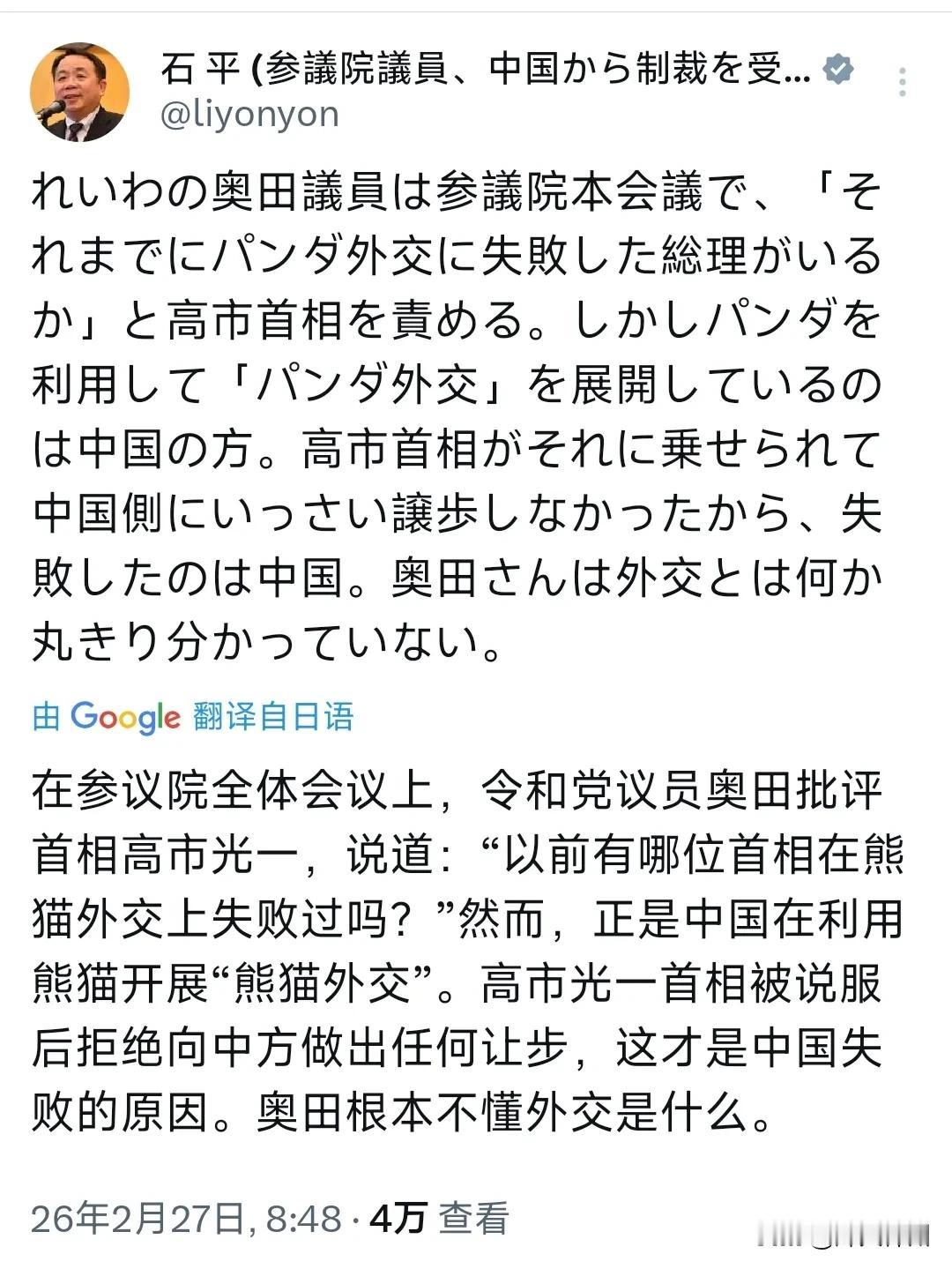 日本参议员、汉奸石平今天(2月27日)写道:“立宪民主党奥田议员在参议院全体会议上质问高市首相,称‘此前可有哪位首相搞砸过熊猫外交?’然而,真正利用熊猫开展‘熊猫外交’的是中国方面。由于高市首相并未被中国牵着鼻子走,也未向中方做出任何让步,因此失败的是中国。奥田先生显然完全不了解什么是外交。” 评几句: 日本参议员石平就熊猫相关议题发表不当言论,歪曲事实、混淆是非,其观点既不符合事实,也不利于中日民间友好交流。 大熊猫一直是中国传递和平与友好的象征,熊猫合作的本质是科学保护与国际友好交流,始终以善意和专业为基础,并非所谓政治操控。中日相关合作出现波折,根源在于日方多次损害双边关系基础,破坏互信与合作氛围。石平对此视而不见,反而倒打一耙指责中方,逻辑难以自洽。 外交的本质是增进互信、促进合作,而不是刻意制造对立、歪曲事实。石平的相关言论充满偏见与片面性,更多是出于政治投机,违背客观事实,也不符合两国人民期待友好交流的共同愿望。 事实胜于雄辩,任何违背常识、煽动对立的言论都站不住脚,也改变不了中国坚持和平发展、推动国际友好合作的坚定立场。
