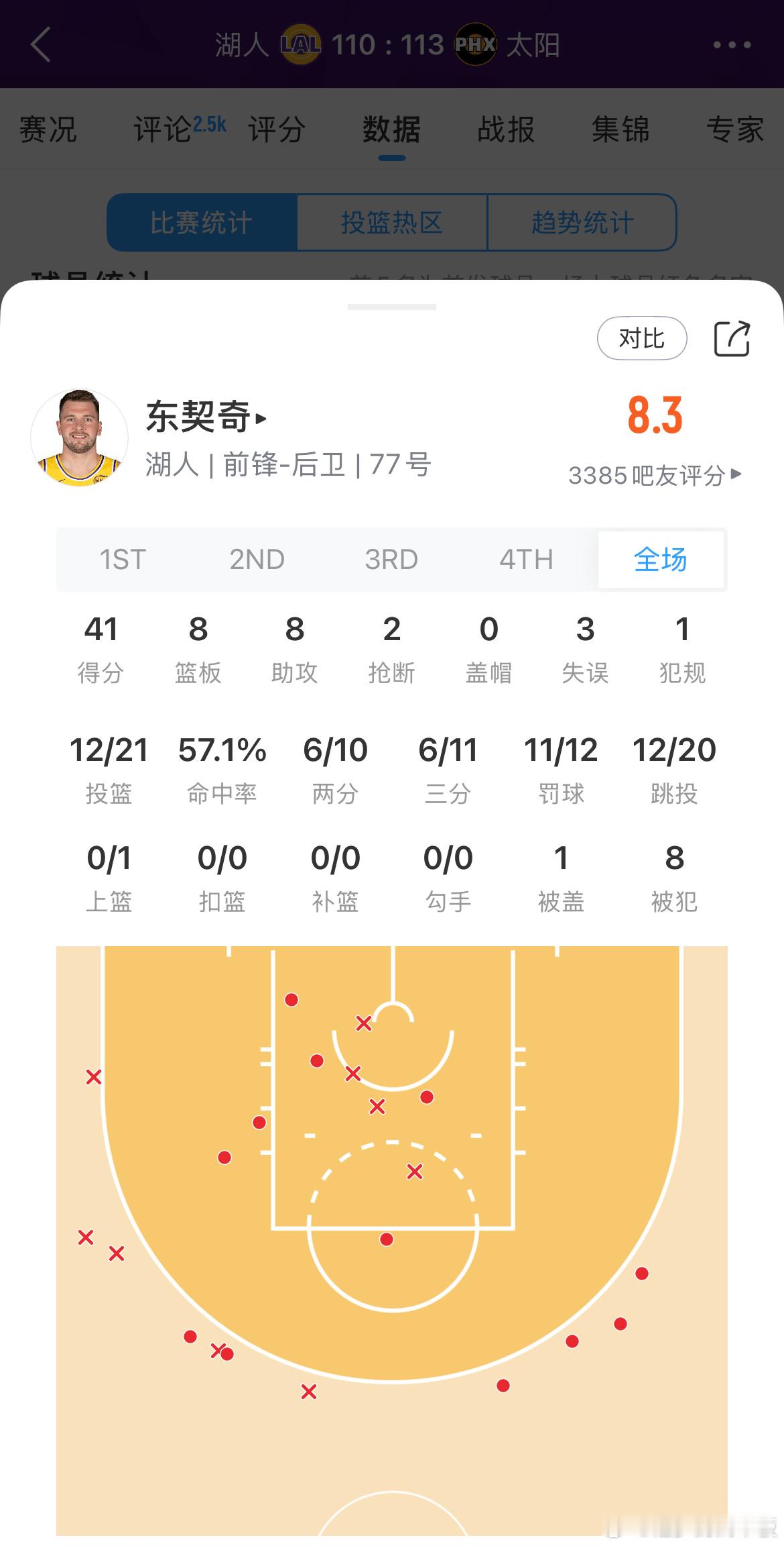 东契奇空砍41分8板8助,本赛季第9次40+队史仅有埃尔金-贝勒、奥尼尔、科比、