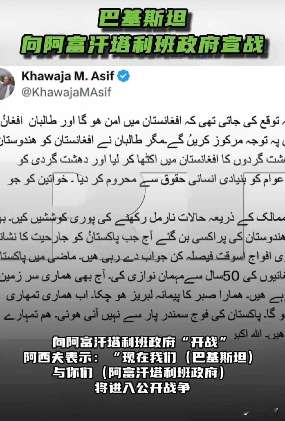 巴基斯坦国防部长在社交平台上向阿富汗塔利班政府“宣战”。 据《今日俄罗斯》等媒体报道,当地时间2月27日,巴基斯坦国防部长赫瓦贾·阿西夫在社交平台X上发文表示,巴基斯坦宣布向阿富汗塔利班政府“开战”。 阿西夫表示:“现在我们(巴基斯坦)与你们(阿富汗塔利班政府)将进入公开战争。这将是一场血腥的战争。巴基斯坦军队并非来自海外。我们是你们的邻居,我们了解你们的处境。”阿西夫指责塔利班政府“将阿富汗变成了印度的殖民地”,在该国聚集了“来自世界各地的恐怖分子并开始输出恐怖主义”,“成为了印度的代理人”。 此前双方冲突不断。26日晚两国在边境地区发生激烈交火,双方均指责对方先挑衅,并宣称打死对方大量作战人员,摧毁或夺取边境沿线哨所。27日凌晨,大批巴空军战机轰炸包括阿富汗首都喀布尔在内的多地军事设施。巴方战报称,空袭打死133名塔利班武装分子,超200人受伤,地面部队在边境地区全面进攻,摧毁27个塔利班据点,占领9个。 巴阿冲突早有端倪,去年10月起双方就因恐怖主义问题多次冲突,虽在土耳其和卡塔尔斡旋下于10月19日达成停火协议,但双方仍偶尔交火,和平谈判也未达成正式协议。巴方认为国内频繁的恐袭活动得到阿富汗塔利班政权纵容和支持,背后还有印度因素;而塔利班否认参与巴境内恐袭。从实际情况看,塔利班对阿富汗基层控制能力有限,边境地区有大批恐怖分子盘踞并渗透至巴境内发动袭击。