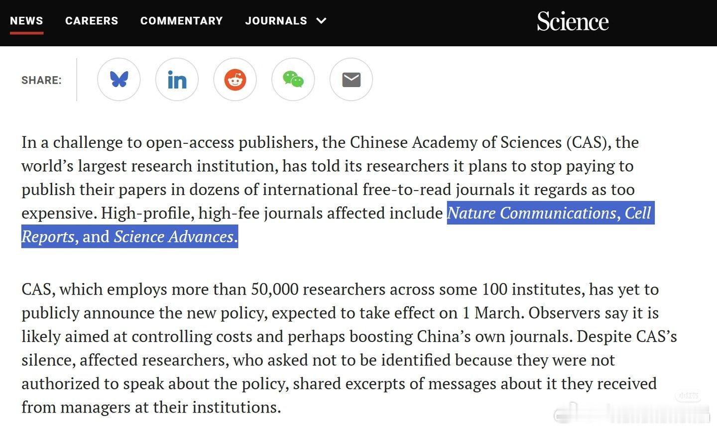 据《科学》新闻( Science News )消息,预计从3月1日起,中国科学院(简称「中科院」)计划停止使用学术经费和中央财政拨款支付约30种国际高收费开放获取( OA )期刊的论文发表费用。这些期刊的单篇发表费用均超过5000美元,受影响期刊包括《自然﹣通讯》( Nature Communications )、《细胞报告》( Cell Reports )和《科学进展》( Science Advances )等知名刊物。