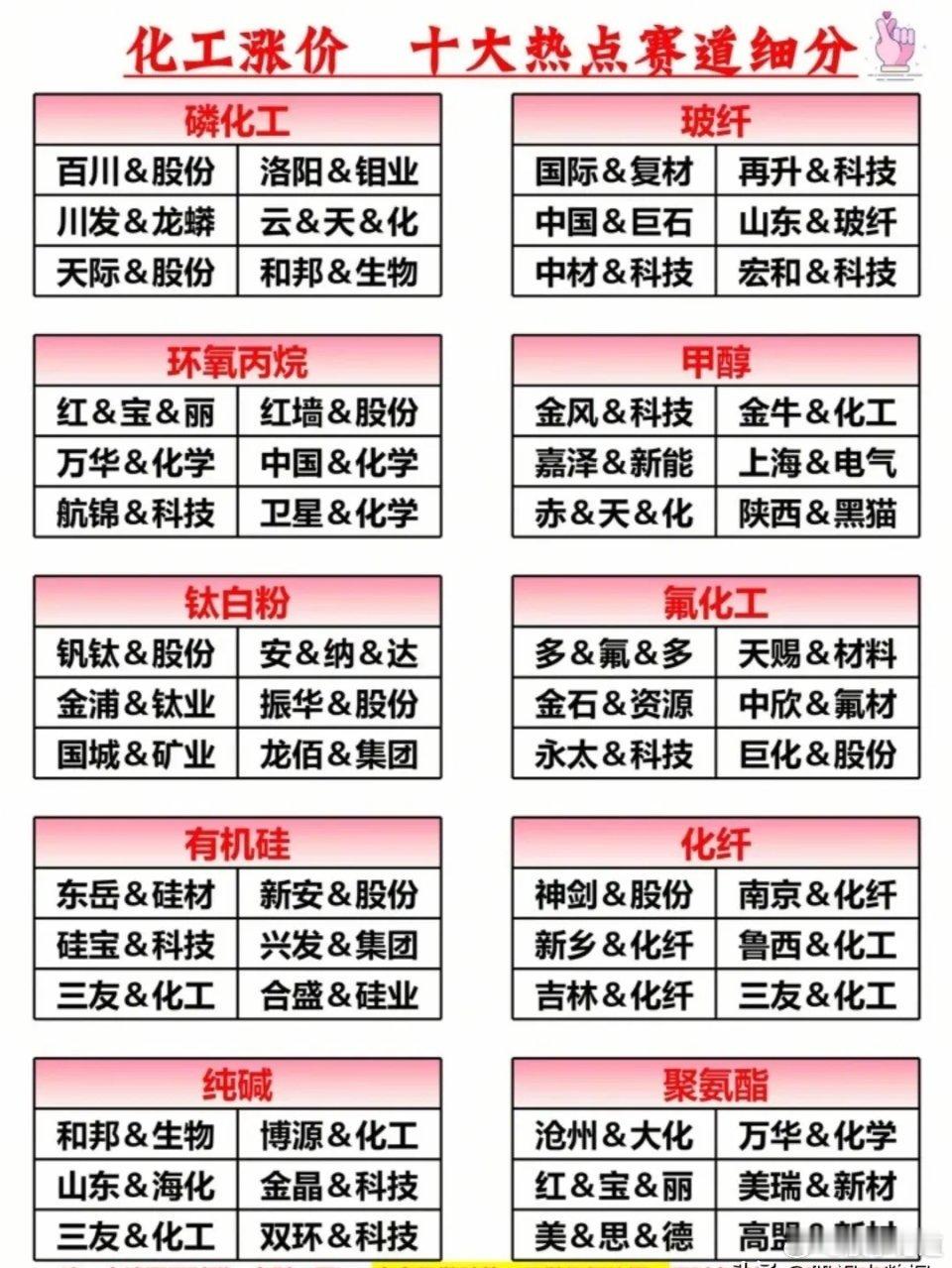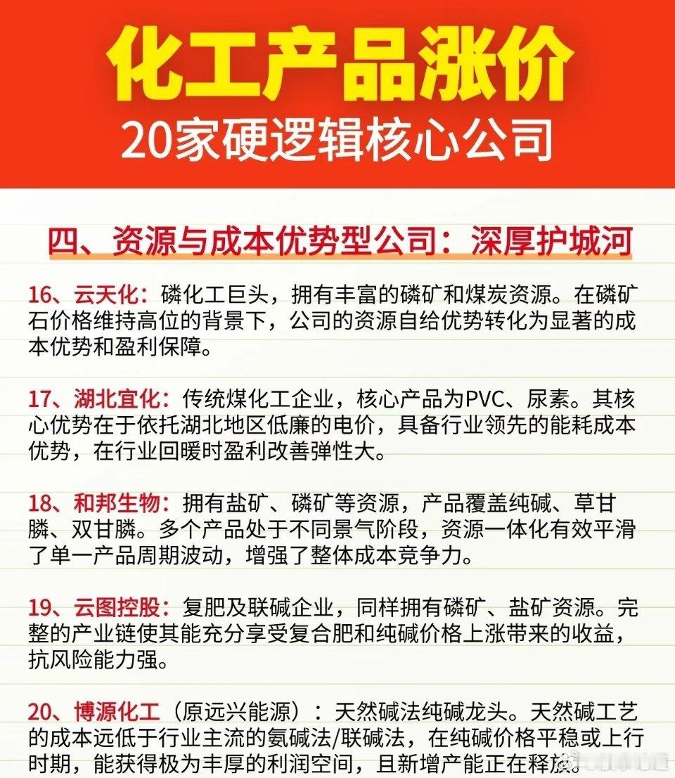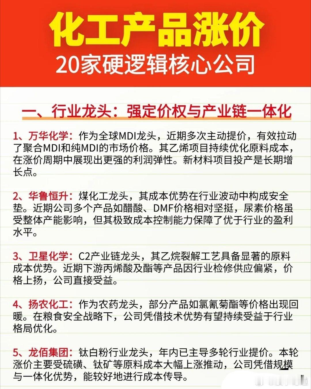 稀缺!化工涨价潮中,只有这20家公司拥有“印钞权”!化工产品涨价潮来袭!20家硬逻辑核心公司,从行业龙头、强周期弹性股、细分冠军到资源成本优势企业,全产业链覆盖,精准把握涨价红利,掘金化工赛道核心机会!化工概念绝对核心龙头代表:万华化学全球MDI第一、华鲁恒升煤化工龙头、 新洋丰磷复肥龙头、云天化磷化工巨头、中泰化学PVC龙头、扬农化工农药龙头、卫星化学C2产业链龙头……~2026化工元年,涨价潮已至!磷化工、玻纤、有机硅、钛白粉、聚氨酯等十大细分赛道全线爆发,各细分核心标的蓄势待发,精准把握产业链红利,掘金化工黄金赛道!理财有风险入市需谨慎!