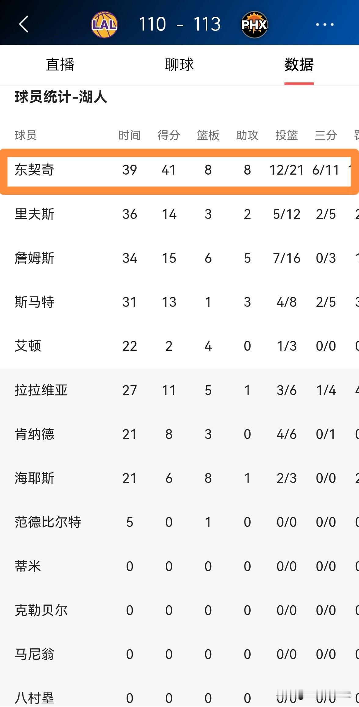 湖人当家球星东契奇真是欲哭无泪!在今天湖人客场以110:113惜败于太阳的比赛中,东契奇狂轰41分8篮板8助攻,却依然无法改变球队失利的命运。 全场比赛下来,东契奇首发出战39分钟,投篮21中12,其中三分球12中6、罚球12中11空砍41分8篮板8助攻2抢断,他的场上正负值为+9。 我相信本场比赛过后,即便东契奇想哭他也没有泪水了。