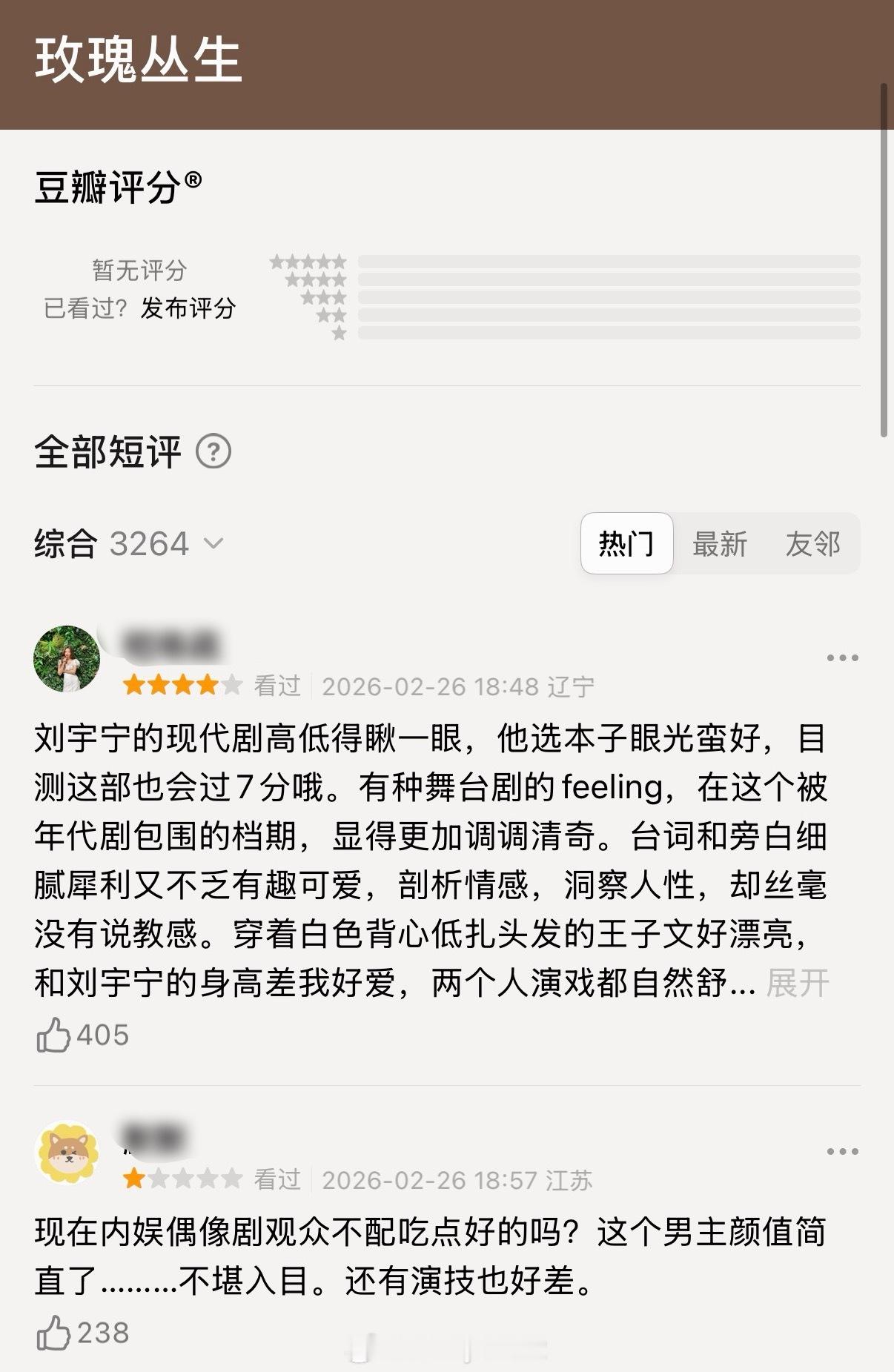 玫瑰丛生昨天首播瓣人评价:剧情俗套,男女主状态不太行,两人不匹配,男主刘宇宁被吐