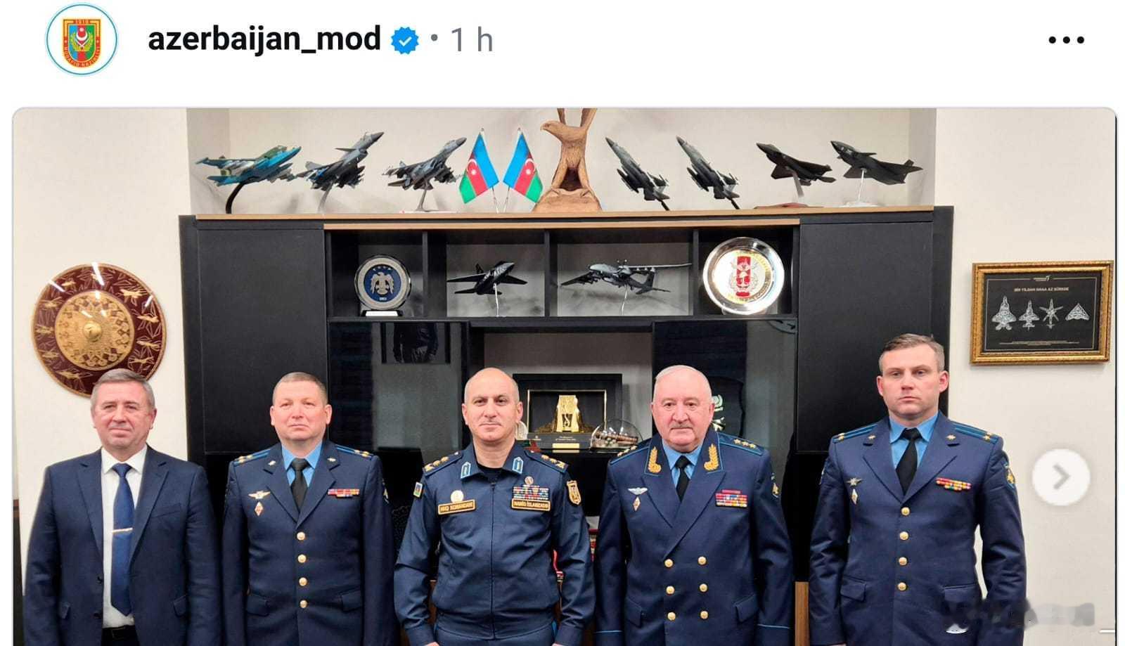 阿塞拜疆空军司令在空军总部会见俄空天军副司令率领的代表团。引人注目的是橱柜上方一