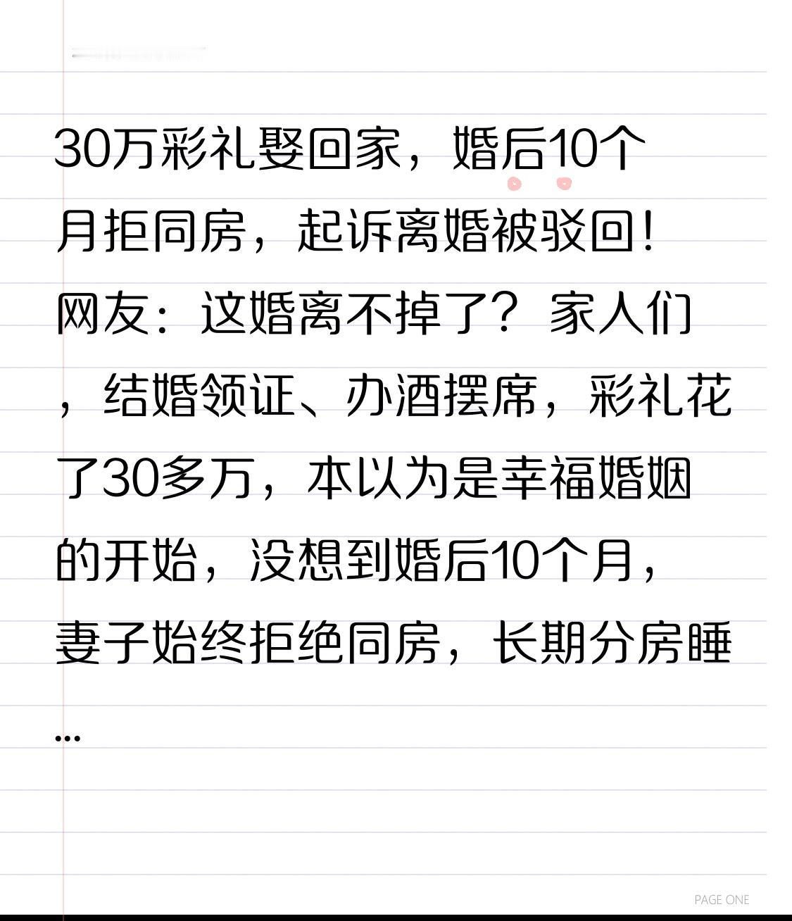30万彩礼娶回家,婚后10个月拒同房,起诉离婚被驳回!网友:这婚离不掉了? 家人们,结婚领证、办酒摆席,彩礼花了30多万,本以为是幸福婚姻的开始,没想到婚后10个月,妻子始终拒绝同房,长期分房睡,连家都很少回!男子忍无可忍起诉离婚,法院却直接驳回:不予离婚!这波操作,全网都炸了! 河北邢台的小高,经人介绍认识了女子小李,两人很快确定关系,按照当地习俗,小高拿出30多万彩礼,加上五金、首饰,风风光光把小李娶进门。可新婚之夜开始,小李就以身体不适、心理抗拒为由,拒绝和小高同房,之后更是长期分房居住,要么回娘家,要么独自生活,这段婚姻彻底成了有名无实的“空壳”。 小高多次沟通、劝说,甚至找家人调解,可小李始终不为所动,丝毫没有履行夫妻义务的意思。看着花光全家积蓄娶来的妻子,却过着守活寡的日子,小高又委屈又愤怒,最终将小李告上法庭,要求离婚并返还彩礼。 本以为事实清楚,离婚十拿九稳,可转折点来了!法庭上,小李坚决不同意离婚,还提交了抑郁、焦虑的诊断报告,声称自己是因为心理问题才拒绝同房,两人感情并未破裂,还有修复可能。而法院审理后认为,小高虽然主张妻子拒同房,但未能提供充分证据,证明“夫妻感情确已破裂”,不符合《民法典》法定离婚条件,最终驳回了小高的离婚请求,彩礼返还的诉求也随之落空。 消息一出,网友们吵翻了!有人心疼小高:“30万打水漂,婚还离不了,太冤了!”有人质疑:“没有夫妻之实,还算什么夫妻?”也有人理性分析:“法院判案看证据,不是凭情理,无性婚姻不是直接判离的理由。” 其实,法律判决离婚的核心,是“感情确已破裂”,拒绝同房只是参考因素,而非法定事由。这场闹剧里,小高输在了证据不足,没能拿出完整的分居记录、沟通凭证,最终陷入离不掉、过不好的困境。 婚姻从来不是儿戏,既不能靠彩礼捆绑,也不能靠法律强行维系。无论是男方还是女方,结婚都应出于真心,履行夫妻义务,承担家庭责任。别让婚姻变成利益交换,别让真心被辜负,更别让本该幸福的生活,变成一地鸡毛的纠缠。 愿每一段婚姻,都始于真心,忠于责任,愿所有付出,都能被温柔以待!