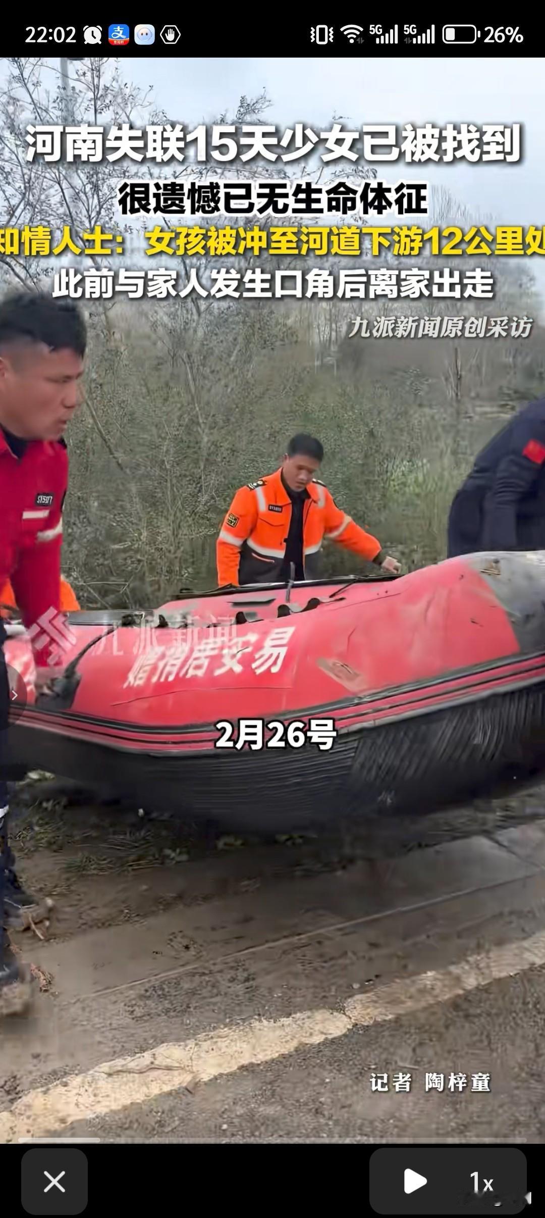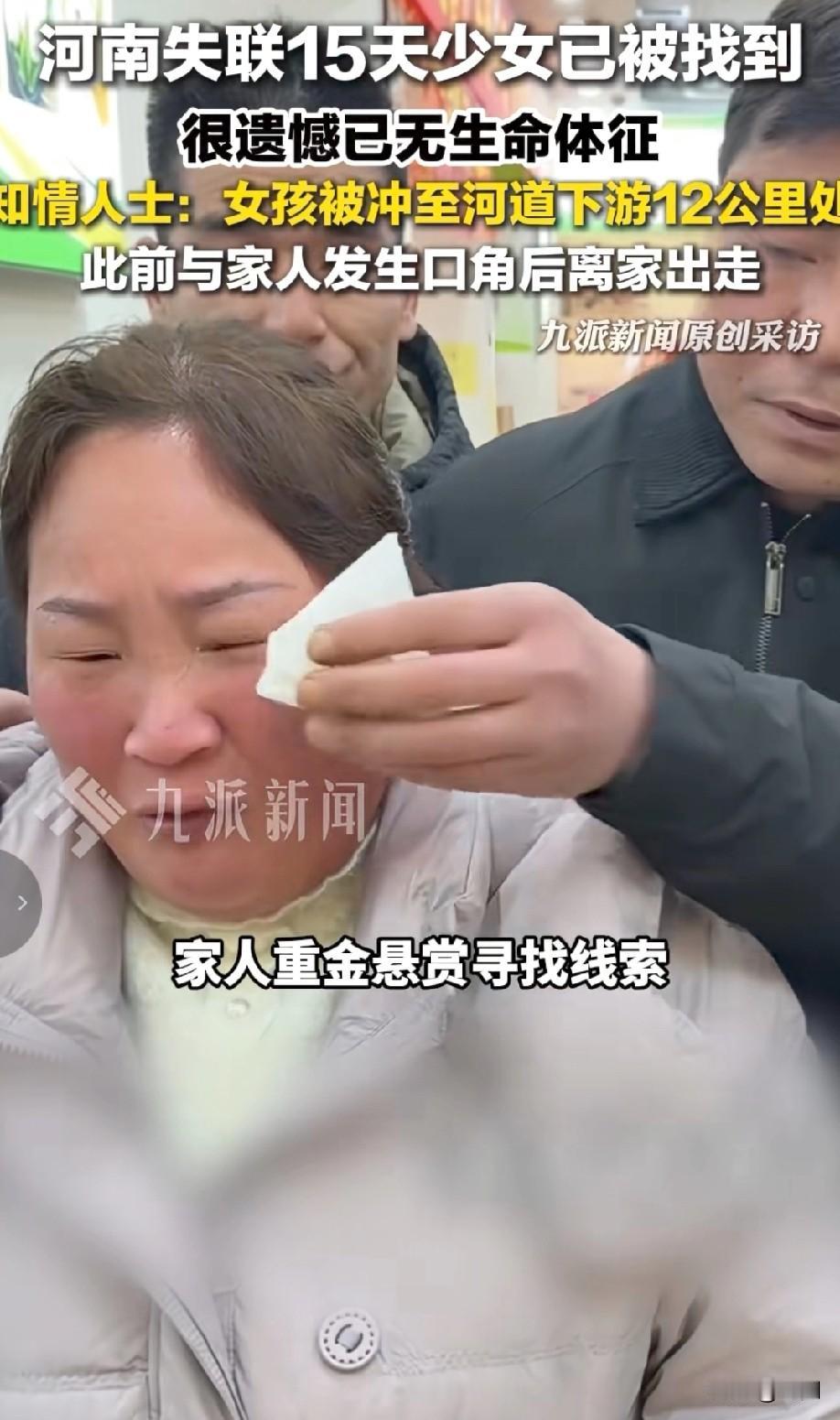 河南失联少女已被找到! 法医:溺亡! 知情人士称:女孩上有姐姐下有弟弟,她是老二,一直跟着爷爷奶奶生活……发现时女孩已被冲到河道下游12公里处,26号遗体打捞上岸! 事件起末:15岁少女凡梦辞在家中与姐姐发生口角,情绪低落,曾坐在沙发上哭泣。当晚约18:20,她独自骑电动车离家外出。后在河边找到其拖鞋,电动车不知去向…… 家属曾悬赏寻人,金额从10万被传至100万,姐姐曾道歉:“我真的很后悔,不该和妹妹发生冲突。凡梦辞,我的亲妹妹,你回来之后怎样打我都行” 这只是一场再普通不过的姐妹小口角,却成了永别。姐姐对着镜头反复道歉崩溃痛哭……姐姐的道歉,字字戳心,却再也换不回妹妹了…… 悲剧已经发生,再说谁对谁错都太晚了。留下的,是家人一辈子的悔恨和遗憾,是无数家庭都该被敲醒的警钟! 整个事件里最让人揪心、也最不符合常理的地方:就是人出事了,车却不见了?至今还是一个疑点……