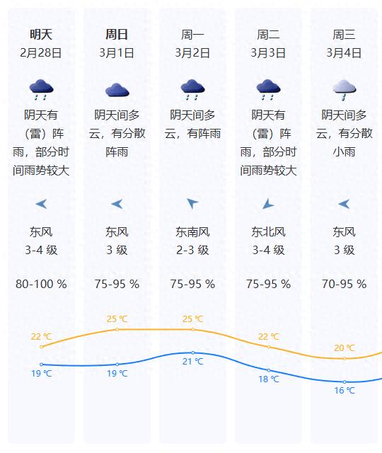 预计27日下午我市阴天,有分散阵雨;夜间至28日,随着南风加强,强降雨中心仍然在我省中北部地区,我市有(雷)阵雨,局地雨势较大,28日白天沿海高地偏东阵风6-7级,日温差小。3月1日阴天间多云,偶有零星小雨。2-3日受新一股冷空气影响,有(雷)阵雨,部分时间雨势较大,气温下降。展望4-5日阴天,间中有小雨,日温差小,体感阴凉。