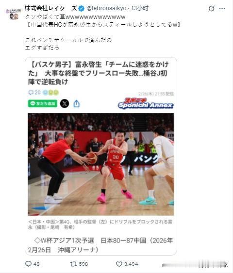 郭士强指导在日本“火”了! 昨天晚上,中国男篮在下半场打出精彩表现,成功完成大逆转,在客场战胜了日本男篮。比赛过程中,中国男篮主教练郭士强指导曾在一个回合与球员沟通时踩到球馆边线并不慎碰到了球,造成对手“失误”出界。由于裁判并没有看清,未对郭士强指导有任何违例吹罚,也算躲过一劫。 有意思的是,这个回合在日本媒体中不断发酵,日本网友不断讨论、转发这个回合,认为中国男篮“胜之不武”,体育板块大量充斥着这张照片,郭士强指导成为了日本篮球迷几乎人人皆知的人物,也算“爆火”了一把。日本媒体及球迷无疑是在为失败找借口,他们不愿接受输球的事实,这一个回合明显不影响大局。此外,日本男篮主教练桶谷太在昨晚的比赛中同样有踩线进场的行为,裁判也是没有任何吹罚,再加上裁判吹罚的明显偏向,可别得了便宜还卖乖了!