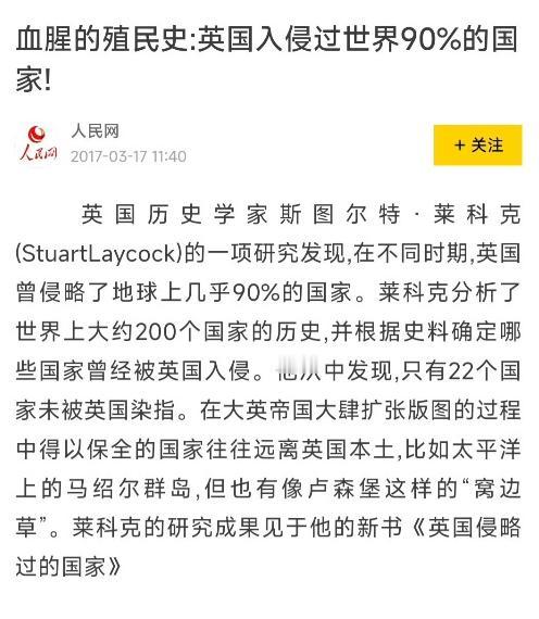 英国历史学家曾表示,英国侵略过地球上几乎90%的国家。如今乌克兰能给北约当炮灰,英国对它的无脑吹捧“功不可没”。 殖民主义虽然早就成了历史书里的旧事,当年的坚船利炮、海外占领、强行掠夺,都随着时代远去了。 但只要认真看看当下的国际局势就会发现,西方的殖民主义从来没有真正退场,只是换了更隐蔽的方式,从直接的武力征服,变成了话术裹挟、地缘操控、代理人博弈。 英国在乌克兰危机里的种种做法,正是这种旧殖民思维在当代最直接的体现。 英国作为曾经的头号殖民帝国,在漫长的历史中靠着武力扩张在全球铺开势力,足迹遍布世界多数地区,给无数国家和地区带去了长期的动荡与苦难,也埋下了很多至今难以化解的矛盾。 那段岁月里,弱小国家没有话语权,只能任由强国摆布。 英国靠着侵略与掠夺完成了自身的积累,这种以强凌弱、操控他人为自己谋利的思维,并没有随着旧殖民体系的瓦解而消失,反而在新的时代里,演化成了更难被普通人识破的新手段。 过去是直接派兵占领、划分势力范围、掠夺资源财富,现在则是用虚假承诺、无脑吹捧、拉帮结派拱火,把弱小国家推到前台当棋子,自己躲在后方坐收渔利,手段变了,自私的内核一点都没变。 在乌克兰危机一步步升级的过程中,英国始终站在拱火递刀的位置,不断向乌克兰传递不切实际的信号,用夸大的支持承诺麻痹对方,把乌克兰一步步推向冲突的最前沿。 这种看似热情的相助,和当年殖民时代操控弱小势力、为宗主国利益服务的逻辑如出一辙。 西方新殖民主义最有迷惑性的地方,就是擅长用漂亮包装掩盖自私的目的,把霸权扩张包装成正义之举,把操控掠夺美化成平等合作。 过去的殖民掠夺明目张胆,谁都能看清侵略者的真面目;现在的殖民操控,裹着自由、安全、盟友互助的外衣,让很多人一时难以分辨背后的算计。 英国对乌克兰的无脑吹捧,就是最典型的伪装,它让乌克兰误以为自己站在正义的一方,能依靠外部力量实现目标,却不知道自己正在成为别人棋盘上的牺牲品。 国家主权被慢慢侵蚀,民众生活被战火摧毁,而发起吹捧与拱火的一方,始终置身事外,还能借机扩大自身的影响力,把风险和代价全都留给乌克兰承担。 真正的帮助,是劝和促谈、守护和平,是尊重他国主权、支持自主发展,而不是一味拱火、无脑吹捧,把别人推到战火里。 那些满口漂亮话、不断递刀拱火的势力,从来都不是真心为弱小国家着想,他们的眼里只有自己的利益,被操控的国家,最终只会落得国土动荡、民生艰难的结局。 历史上这样的例子数不胜数,如今的乌克兰,不过是又一个被新殖民主义伤害的对象。 西方殖民主义的新形态,伤害的不只是被操控的国家,也在不断破坏全球的和平与稳定。 它打破了国家间平等相处的基本准则,让世界陷入更多的分裂与对抗,让更多普通民众承受流离失所、生活困顿的苦难。 无论是过去的武力殖民,还是现在的地缘操控、经济裹挟,本质都是对国家主权的侵犯,对公平正义的践踏,既不符合时代发展的潮流,也违背了全世界爱好和平的人们的共同心愿。 如今的世界,和平与发展是人心所向,国家不分大小强弱,都应该享有平等的权利,都应该自主决定自己的发展道路。 旧的殖民思维、霸权逻辑,早已跟不上时代的脚步,英国等西方势力抱着过时的理念不放,试图用操控与拱火维护自身霸权,最终只会被时代所抛弃。 乌克兰的经历给所有国家提了一个醒,面对外部的吹捧与诱惑,必须保持清醒的头脑,坚守独立自主的底线,不依附、不盲从,才能守护好国家的根本利益,才能让民众过上安稳平和的生活。 信源:田文林:西方殖民主义并未“人散曲终”——中国青年网