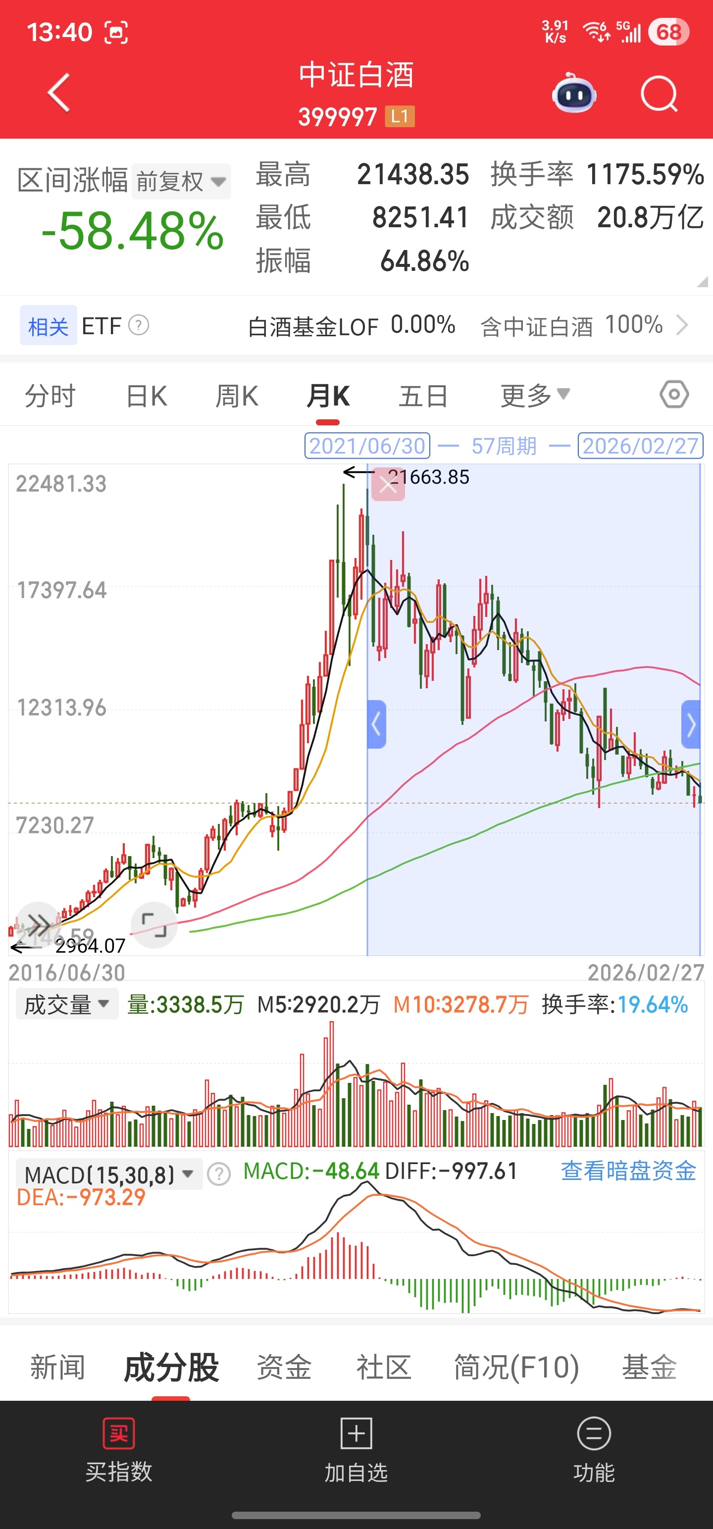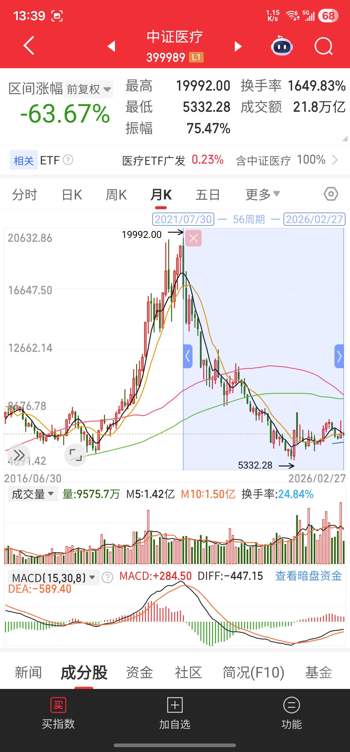 无独有偶,在上一个周期中并列的三驾马车中的另外两个,白酒还跌着58%,医疗还跌着63%