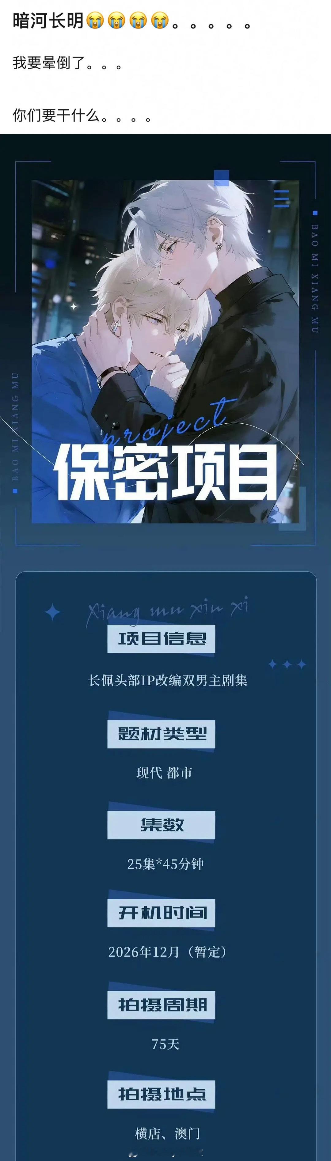 今年到底有多少个保密项目……暗河长明也要拍了,粉丝提名让7.5奖励CP的江衡和李沛恩来演,再下海行不行?