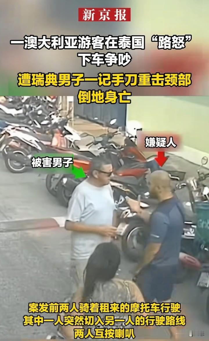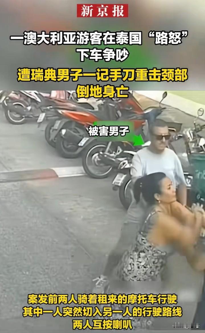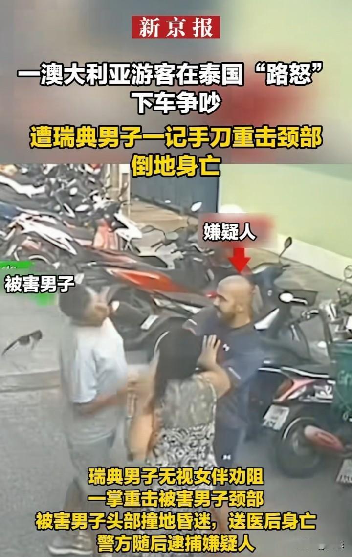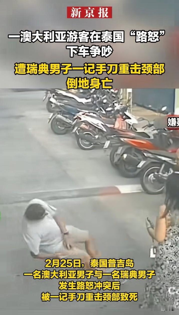 冲动是魔鬼,2月25日泰国普吉岛一澳大利亚男子和一瑞典男子路怒发生冲突。瑞典男子无视女伴的劝阻,瑞典男子用手砍向澳大利亚男子的颈部,澳大利亚男子头部倒地,昏迷不醒,送医后,男子不幸去世。警方随后逮捕犯罪嫌疑人。 本来是一件很普通的事,现在弄成这样,这下好了,害人害己。然后互相谦让一下,也许就不会发生这样的事。 忍一时风平浪静,退一步海阔天空,在国外一定要注意言行举止。 希望大家引以为戒!