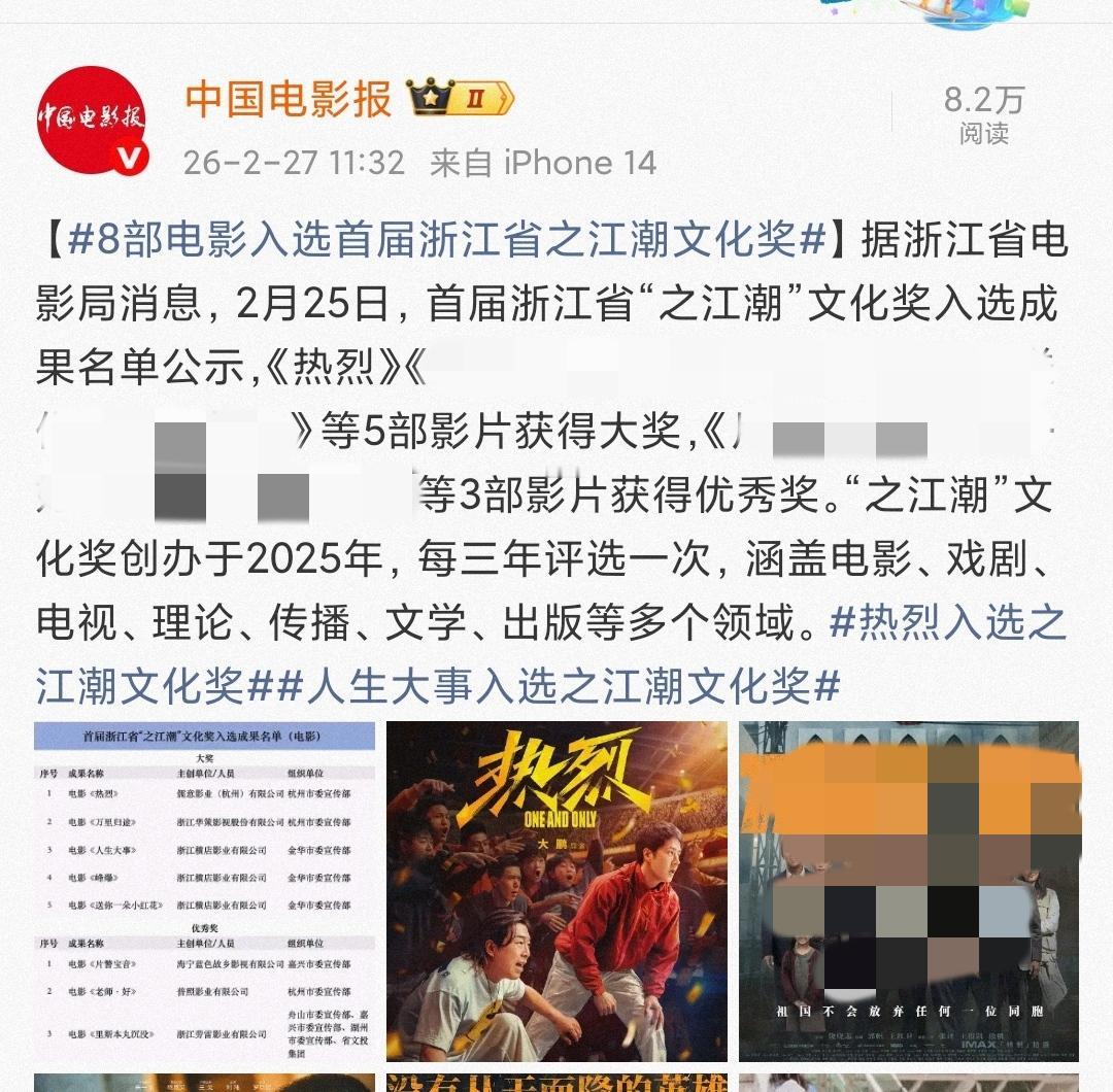 王一博主演的电影《热烈》入选首届浙江省之江潮文化奖大奖! 恭喜热烈,恭喜王一博!王一博不仅凭《热烈》中陈烁一角的精彩演绎获得金鸡华表影帝双提名,《热烈》也获得五个一工程优秀作品奖! 导演亲口说先有了王一博才有了《热烈》,内娱唯有王一博才能完美驾驭陈烁这个角色,才让《热烈》真正热烈起来,没有任何人能够替代。 王一博