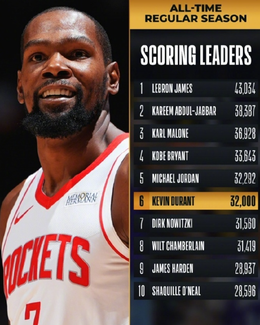 NBA常规赛,火箭客场113-108逆转魔术。此役,杜兰特出战39分38秒,28中14,其中三分10中2,罚球10中10,得到40分8篮板3助攻2抢断,正负值+11。杜兰特今晚生涯得分不仅突破32,000大关,而且砍下个人生涯第431次30+,追平科比·布莱恩特,并列历史第五。