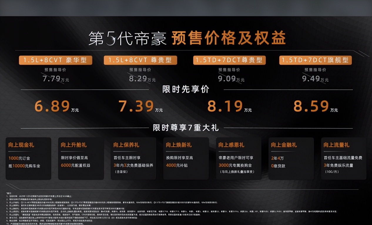 对于追求空间、注重经济性,又不想牺牲驾乘品质的家庭用户来说,第5代帝豪无疑是最懂消费者的明智之选。值得一提的是,现在预售期内预订第5代帝豪,不仅能享受6.89万元起的亲民预售价,还可获得1000元抵10000元购车金、价值6000元配置权益以及2年4万0息贷款等多重优惠。