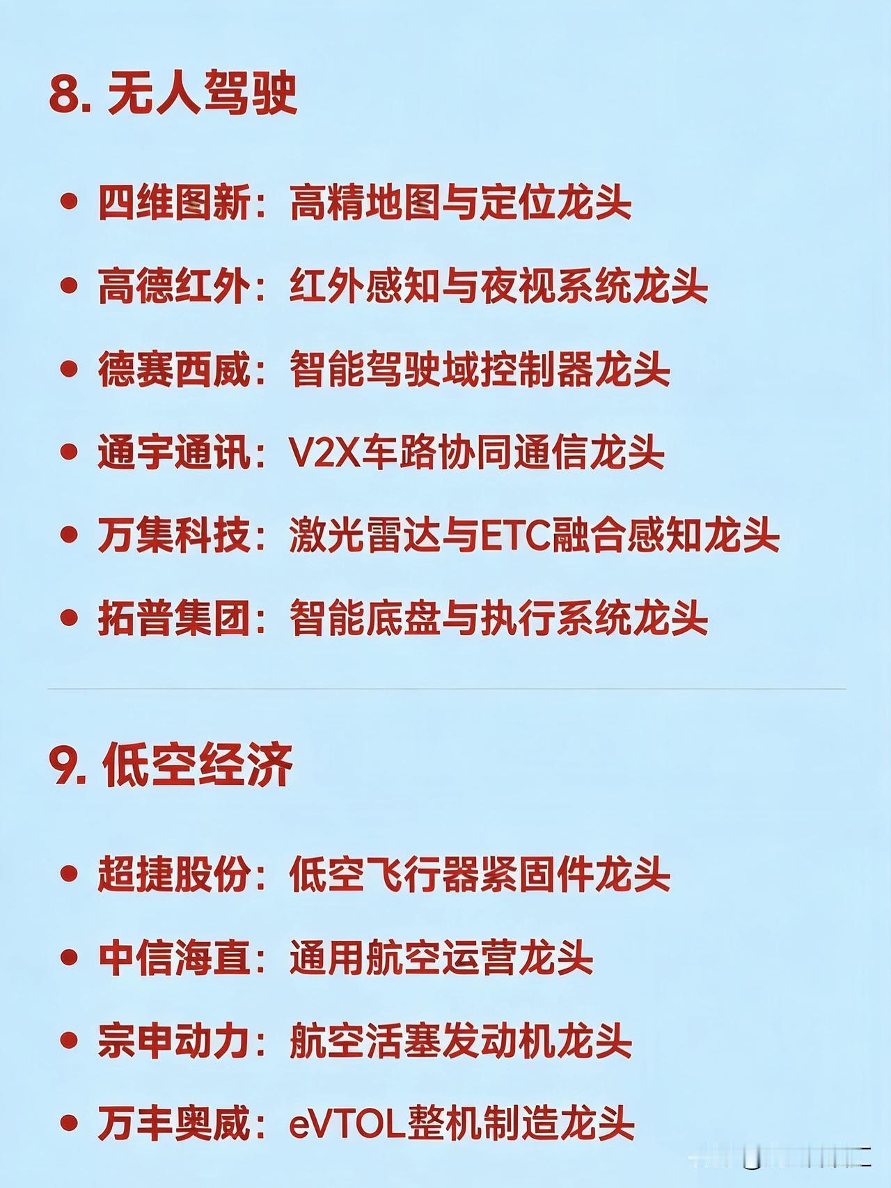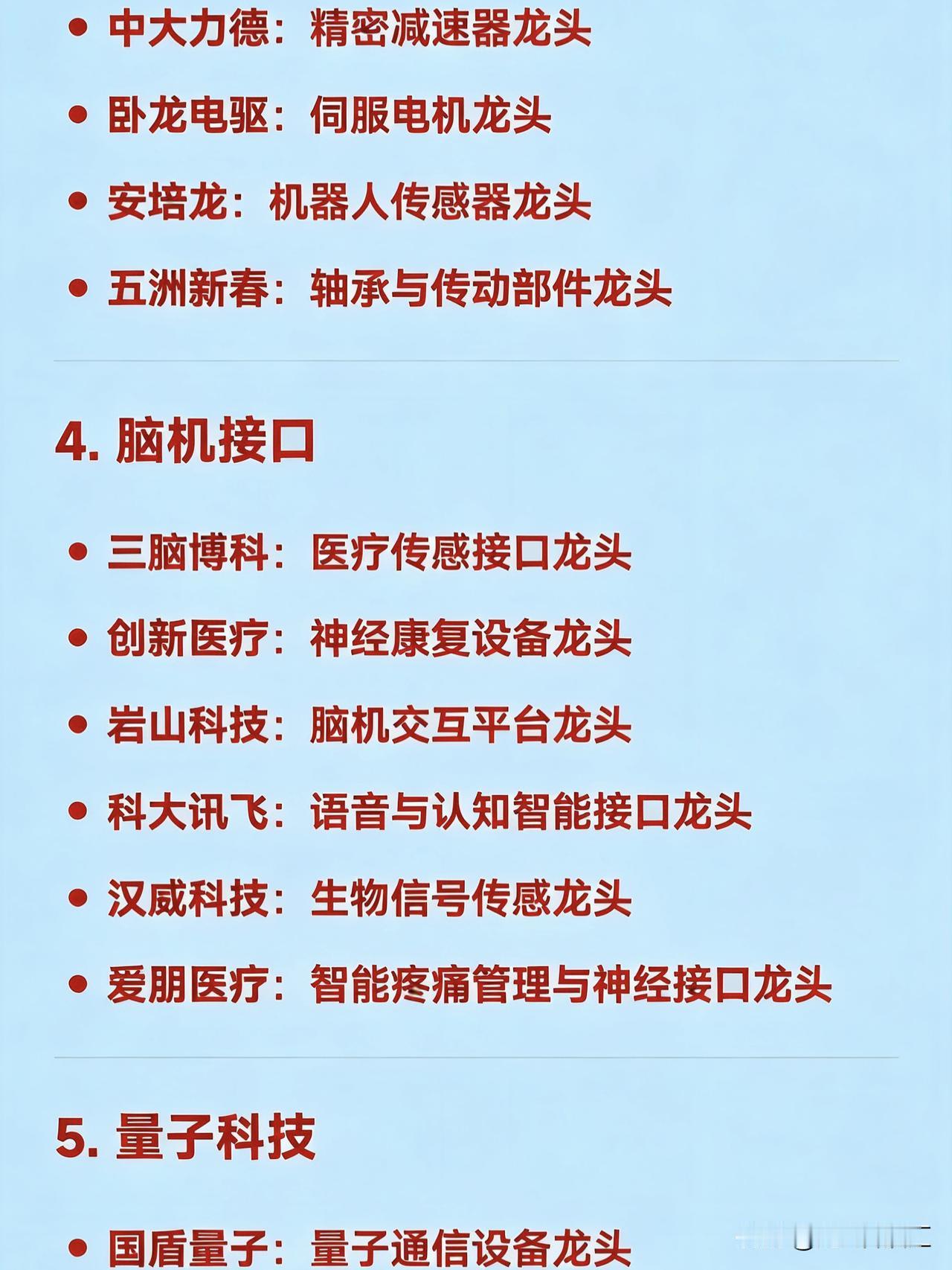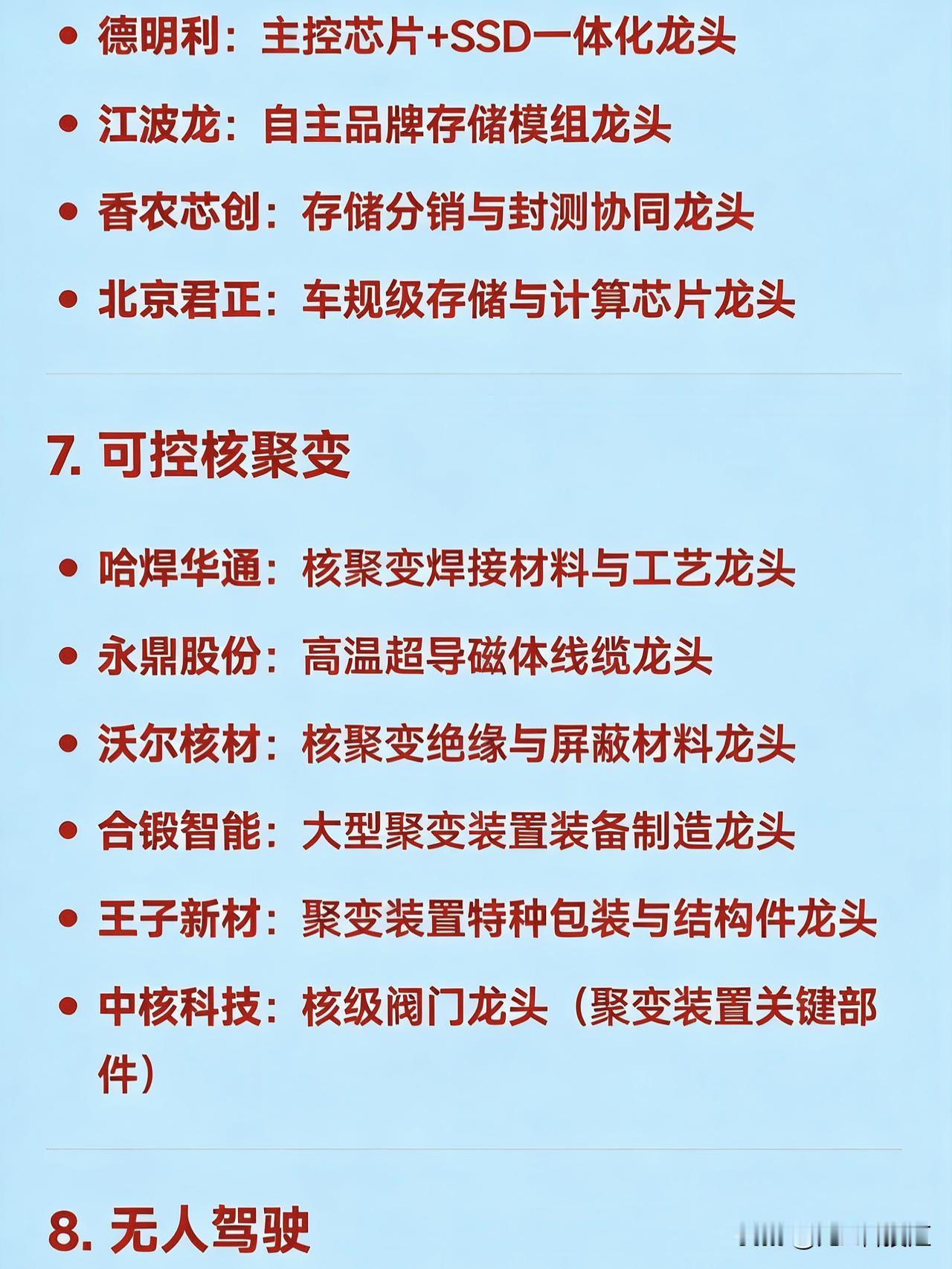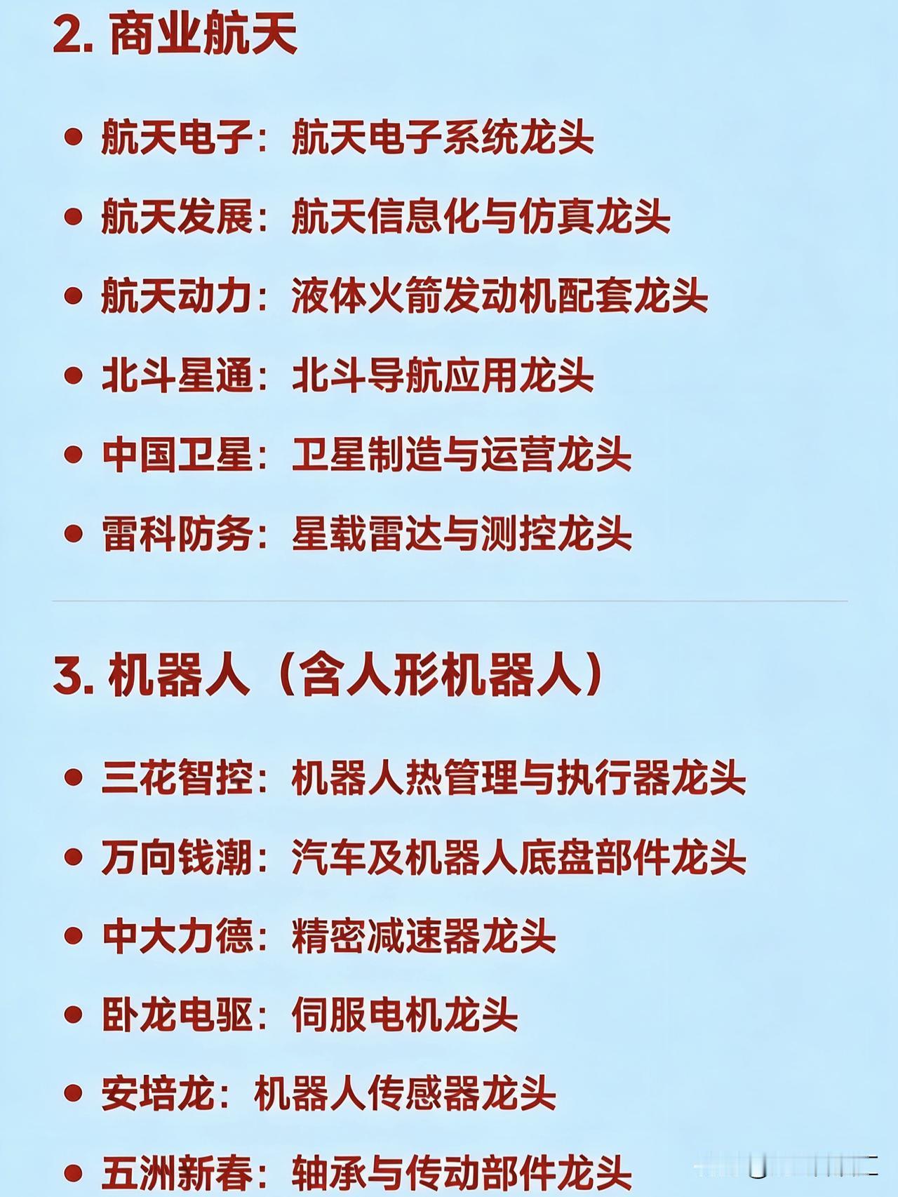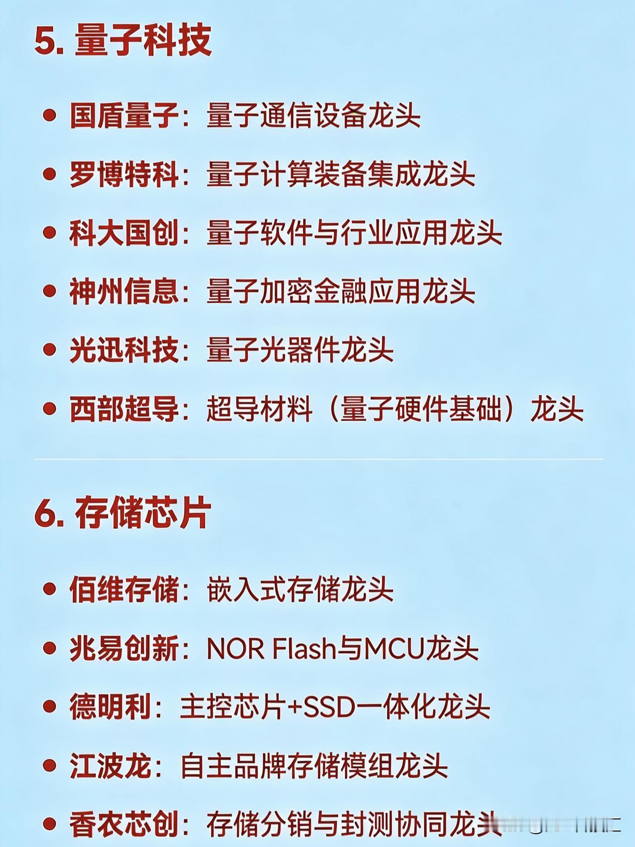 2026年2月27日十大热点科技及其产业链核心龙头 1. AI应用 蓝色光标:AI营销龙头 易点天下:AI出海营销龙头 值得买:AI消费内容推荐龙头 昆仑万维:AI大模型与内容生成龙头 省广股份:数字营销+AI广告龙头 利欧股份:AI+短视频/流量运营龙头 2. 商业航天 航天电子:航天电子系统龙头 航天发展:航天信息化与仿真龙头 航天动力:液体火箭发动机配套龙头 北斗星通:北斗导航应用龙头 中国卫星:卫星制造与运营龙头 雷科防务:星载雷达与测控龙头 3. 机器人(含人形机器人) 三花智控:机器人热管理与执行器龙头 万向钱潮:汽车及机器人底盘部件龙头 中大力德:精密减速器龙头 卧龙电驱:伺服电机龙头 安培龙:机器人传感器龙头 五洲新春:轴承与传动部件龙头 4. 脑机接口 三脑博科:医疗传感接口龙头 创新医疗:神经康复设备龙头 岩山科技:脑机交互平台龙头 科大讯飞:语音与认知智能接口龙头 汉威科技:生物信号传感龙头 爱朋医疗:智能疼痛管理与神经接口龙头 5. 量子科技 国盾量子:量子通信设备龙头 罗博特科:量子计算装备集成龙头 科大国创:量子软件与行业应用龙头 神州信息:量子加密金融应用龙头 光迅科技:量子光器件龙头 西部超导:超导材料(量子硬件基础)龙头 6. 存储芯片 佰维存储:嵌入式存储龙头 兆易创新:NOR Flash与MCU龙头 德明利:主控芯片+SSD一体化龙头 江波龙:自主品牌存储模组龙头 香农芯创:存储分销与封测协同龙头 北京君正:车规级存储与计算芯片龙头 7. 可控核聚变 哈焊华通:核聚变焊接材料与工艺龙头 永鼎股份:高温超导磁体线缆龙头 沃尔核材:核聚变绝缘与屏蔽材料龙头 合锻智能:大型聚变装置装备制造龙头 王子新材:聚变装置特种包装与结构件龙头 中核科技:核级阀门龙头(聚变装置关键部件) 8. 无人驾驶 四维图新:高精地图与定位龙头 高德红外:红外感知与夜视系统龙头 德赛西威:智能驾驶域控制器龙头 通宇通讯:V2X车路协同通信龙头 万集科技:激光雷达与ETC融合感知龙头 拓普集团:智能底盘与执行系统龙头 9. 低空经济 超捷股份:低空飞行器紧固件龙头 中信海直:通用航空运营龙头 宗申动力:航空活塞发动机龙头 万丰奥威:eVTOL整机制造龙头 安达维尔:机载设备与维修服务龙头 光启技术:超材料隐身与结构件龙头 10. 固态电池 先导智能:固态电池整线设备龙头 国轩高科:半固态电池量产龙头 恩捷股份:固态电解质膜材料龙头