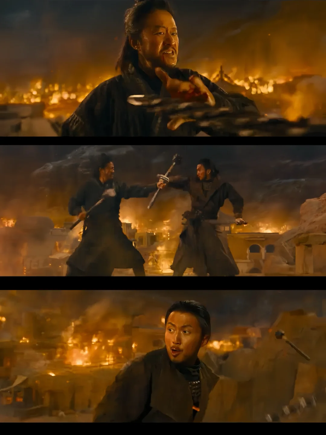 🆘预告里吴京、李连杰、谢霆锋打戏给我看爽了,先是吴京vs谢霆锋:长刀对双锏,兵器撞得火星子直冒,是真发力、真格挡。吴京的刀法沉稳带着西北摔跤的刚猛,每一刀劈下去都有重量;谢霆锋双锏快、准、辣,两人贴身缠斗,黄沙飞起来,呼吸都重,这真是实打实打出来的!