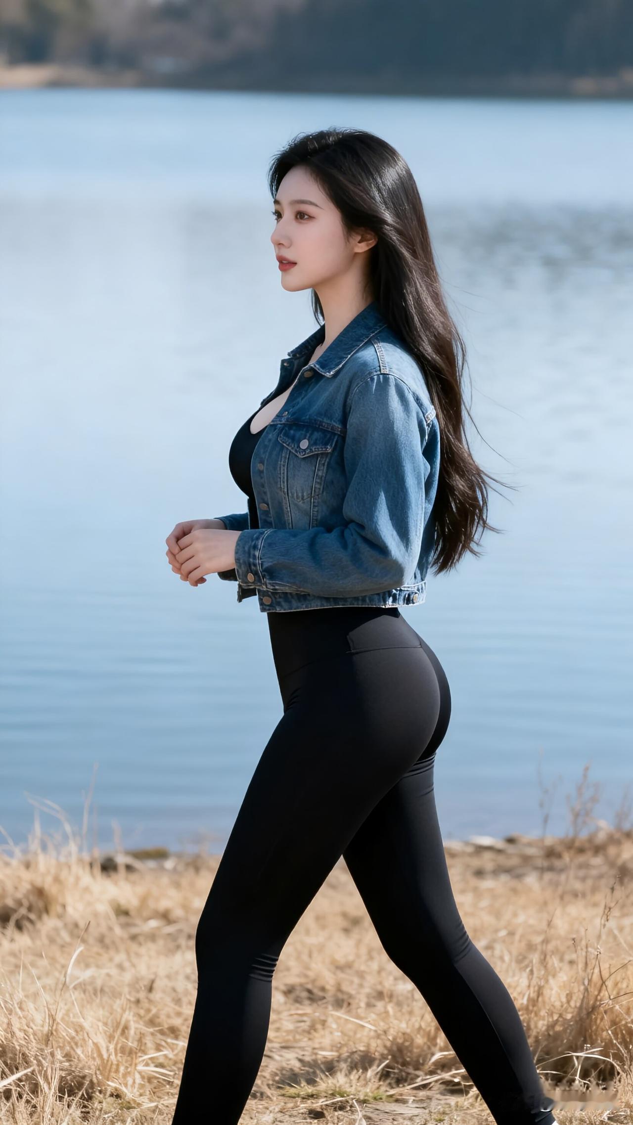 湖边的风带着水汽,牛仔外套裹着肩,黑色瑜伽裤贴在腿上,每一步都带着风的节奏。长发被吹得翻飞,像在和湖水对话。站在枯黄的草甸上,看着水面泛起涟漪,忽然觉得自然的美,从来都不需要修饰。牛仔的硬朗与身体的柔软,在风里撞出了最舒服的平衡。