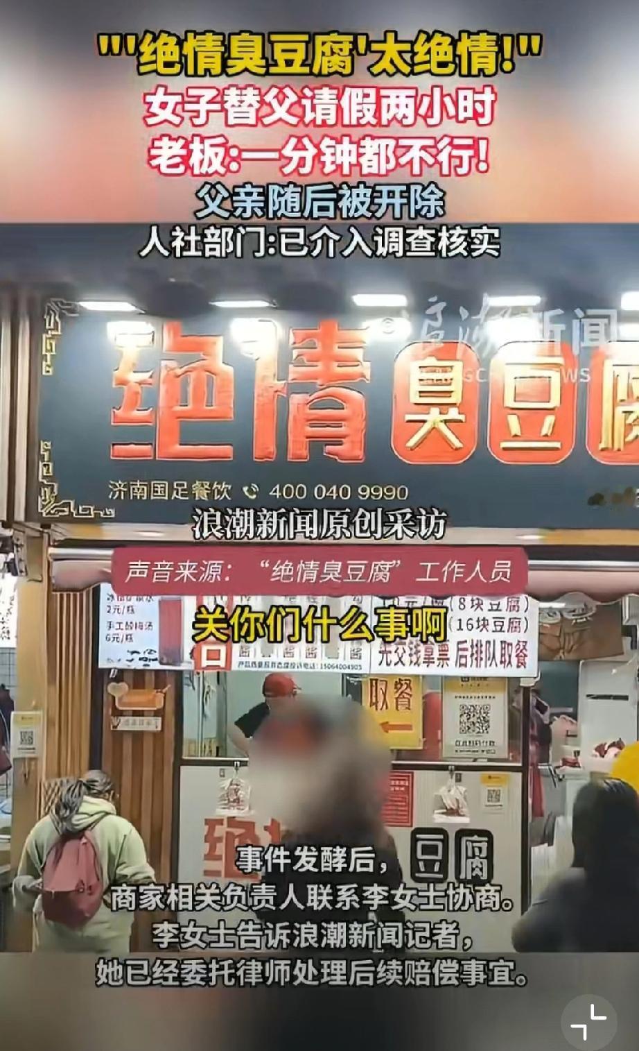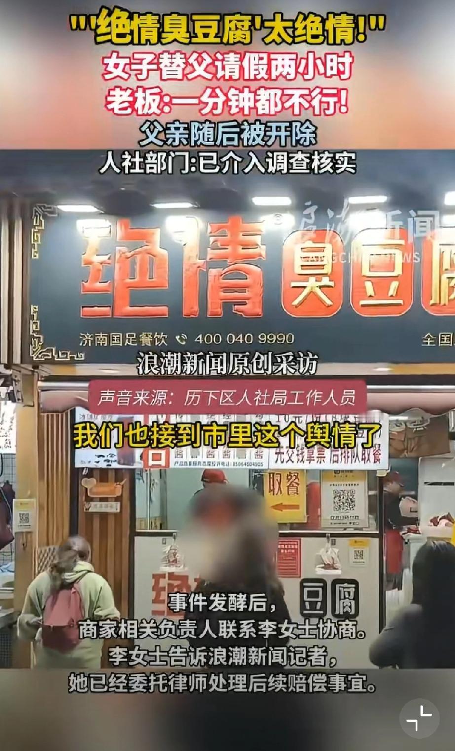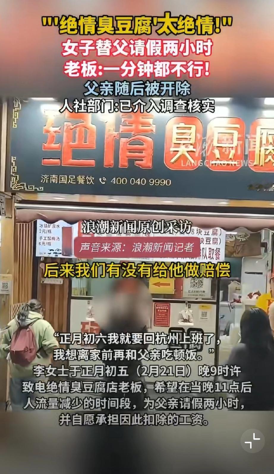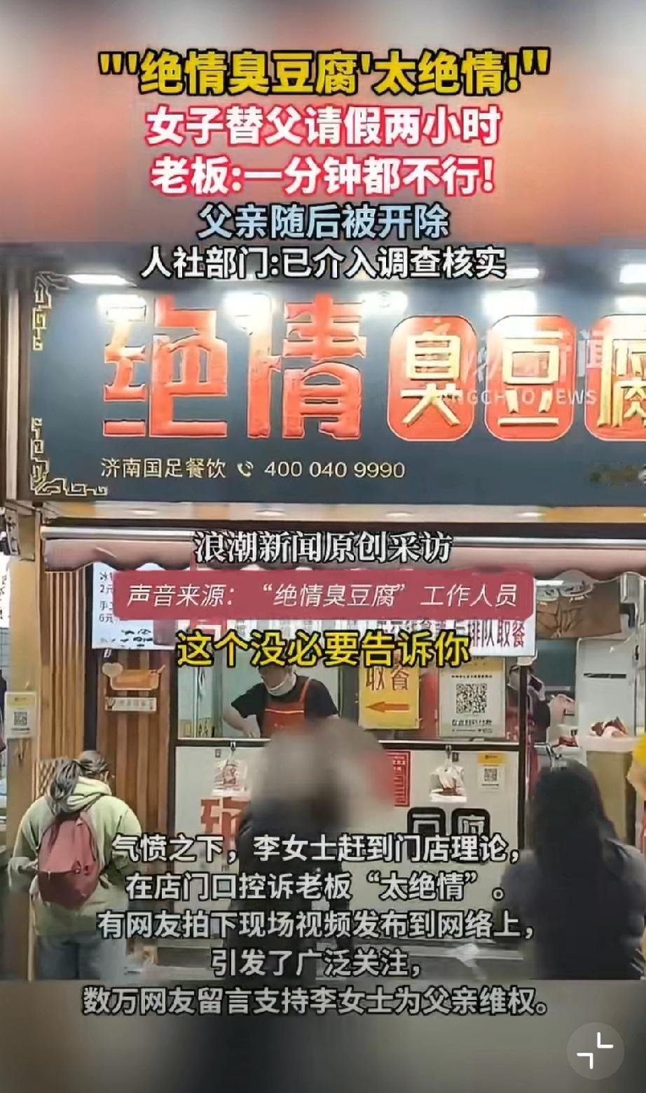 活久见!绝情臭豆腐店,女儿想陪离家前的父亲吃顿团圆饭,替常年熬夜到凌晨、春节只休一天的老父亲请两小时假,还自愿扣工资挑客流少的时段,老板竟一口怼死,转头就把他父亲开除了!这店名真没取错,这老板简直比臭豆腐还“臭”!但绝情臭豆腐何以如此绝情?关键还是任性,所以建议严查到底!必须让这老板为违法辞退买单,还打工人一个公道,别让黑心商家肆意践踏劳动者尊严! 济南身边事 绝情小吃
