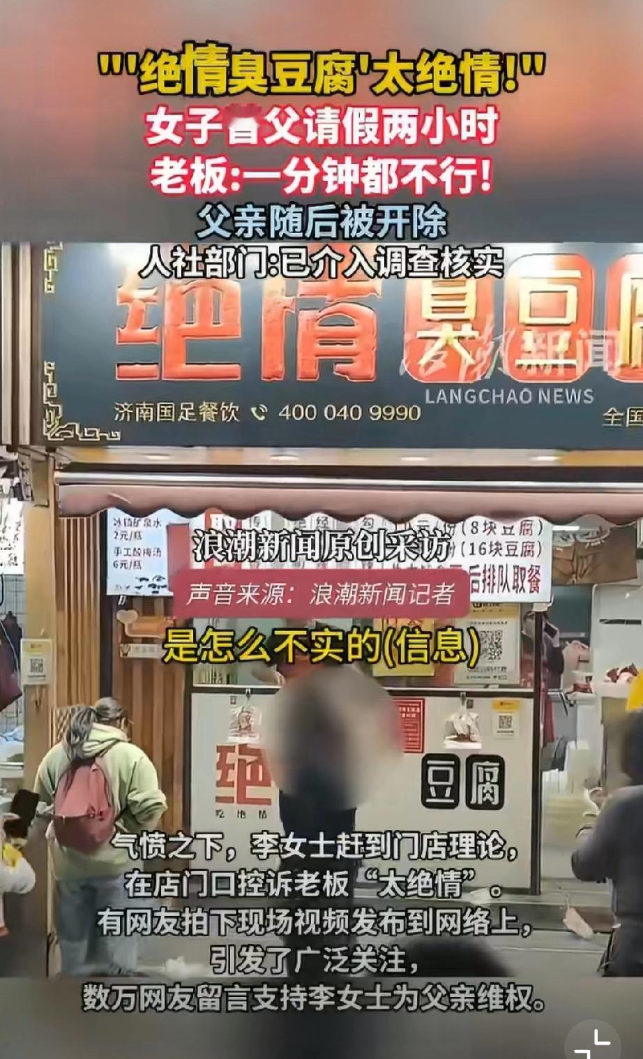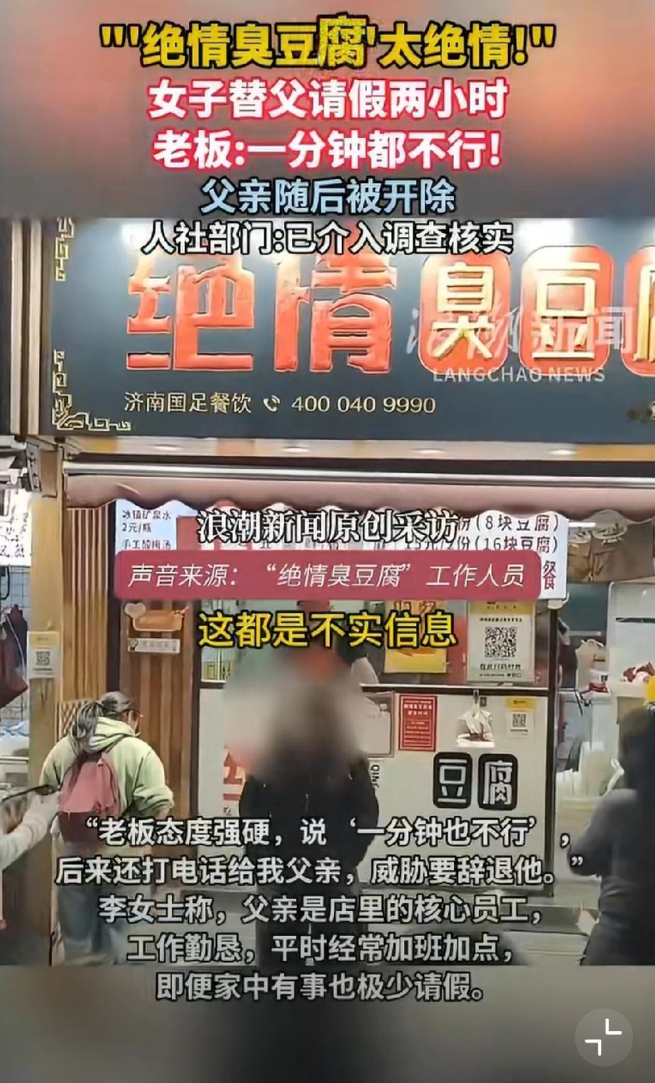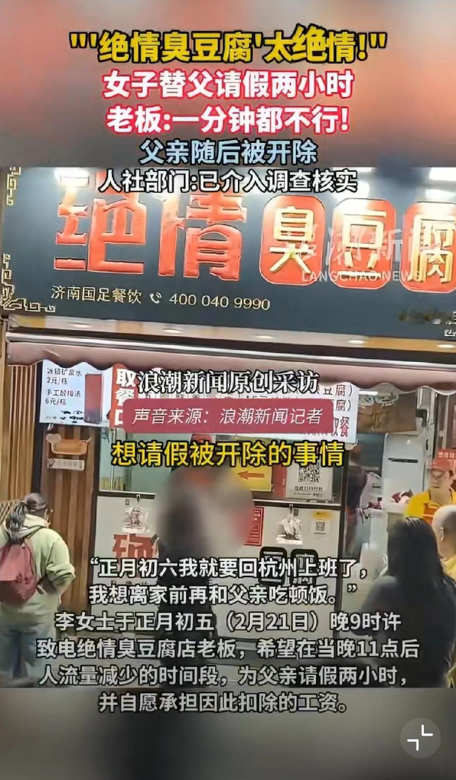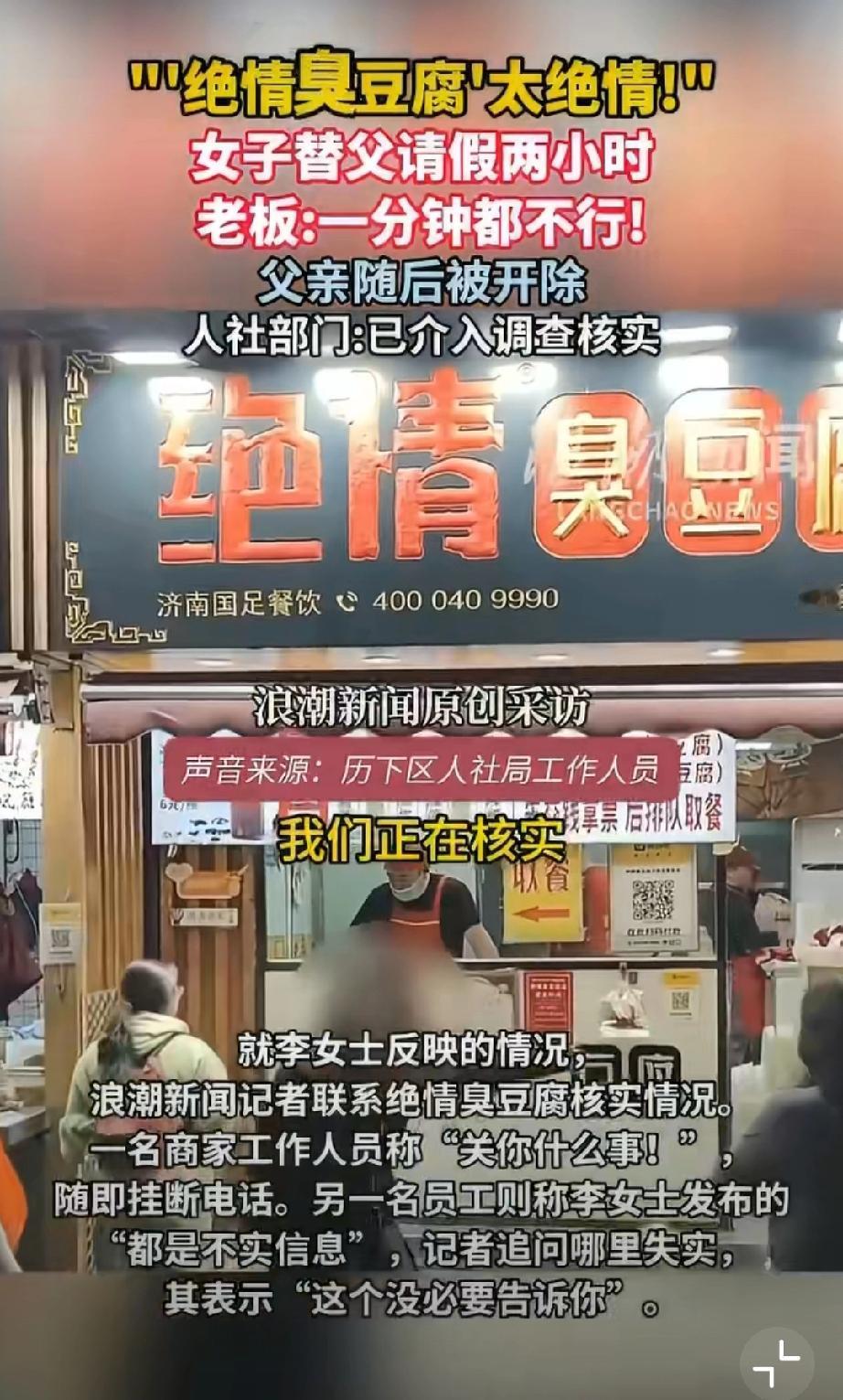 活久见!绝情臭豆腐店,女儿想陪离家前的父亲吃顿团圆饭,替常年熬夜到凌晨、春节只休一天的老父亲请两小时假,还自愿扣工资挑客流少的时段,老板竟一口怼死,转头就把他父亲开除了!这店名真没取错,这老板简直比臭豆腐还“臭”!但绝情臭豆腐何以如此绝情?关键还是任性,所以建议严查到底!必须让这老板为违法辞退买单,还打工人一个公道,别让黑心商家肆意践踏劳动者尊严! 济南身边事 绝情小吃