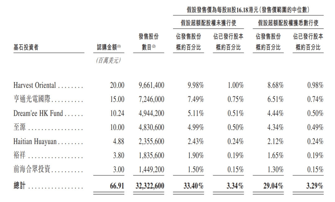 本次发行以机制B分配,公开固定10%,无强制回拨。国配引入7家基石投资者,包括HarvestOriental(嘉实基金)、亨通光电、君宜资本、至源、海天国际等,认购合计约5.23亿港元,持股占全球发售股份的33.40%。