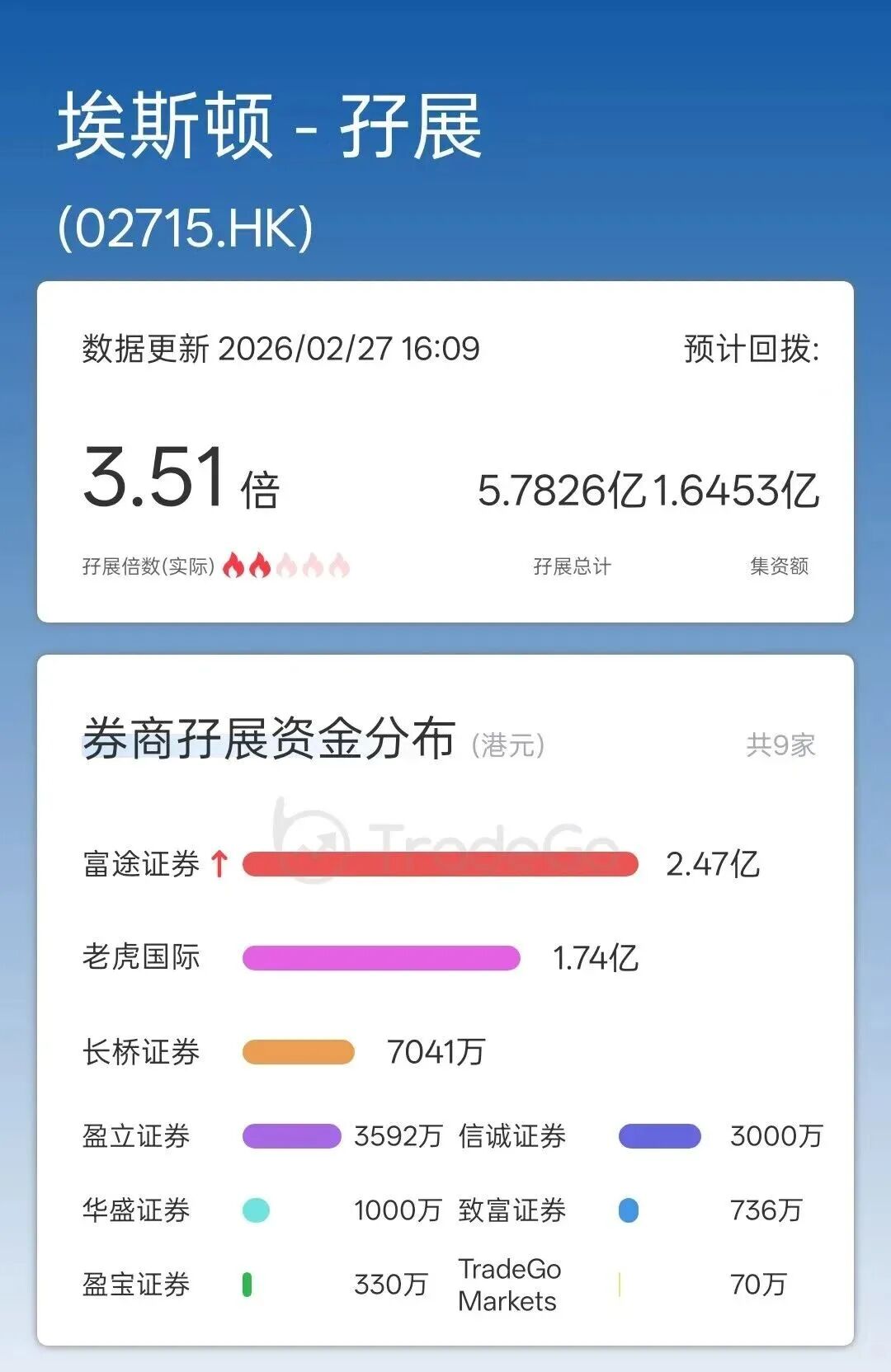 据TradeGo新股孖展数据,截至2月17日16时,埃斯顿的孖展认购总额约5.78亿港元,孖展认购倍数约3.51倍。其中,富途证券、老虎国际、长桥证券分别放出2.47亿、1.74亿、0.70亿港元的孖展。
