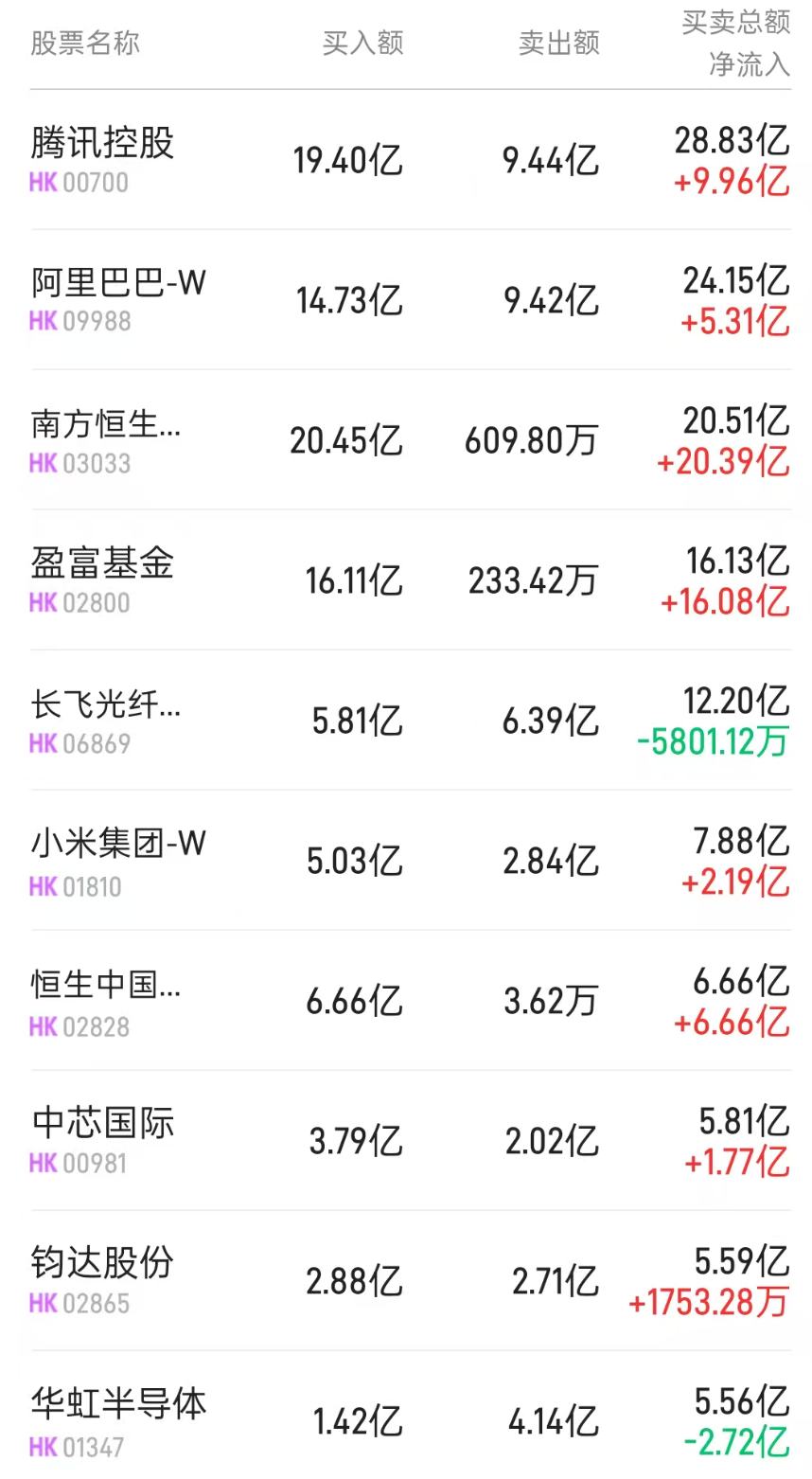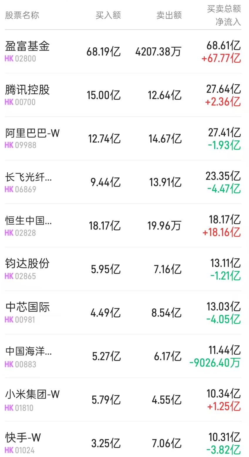 北水净买入最多的个股是盈富基金(02800)、恒生中国企业(02828)、南方恒生科技(03033)。北水净卖出最多的个股是长飞光纤光缆(06869)、华虹半导体(01347)、中芯国际(00981)。