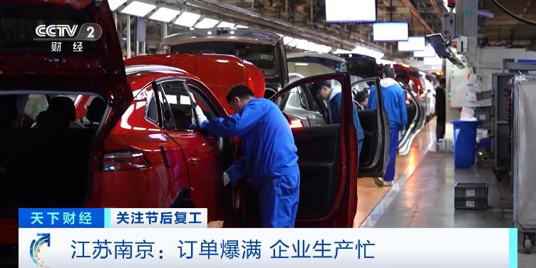 在南京市江北新区的一家大型汽车生产企业,其中一个车间面积4万平方米,产线从脚下延伸到了头顶,工作人员正在紧张忙碌着,一辆辆崭新的汽车高效地走向流水线。这里每天可以生产汽车1000辆左右。一些刚刚上市的新款新能源汽车产品,销售非常火爆,订单已经排到了今年下半年。正月初五这里已经全员在岗赶订单。这个车间,每天两个班组,1200多名工人日夜在岗,这个数字是去年春节同期的2.5倍。