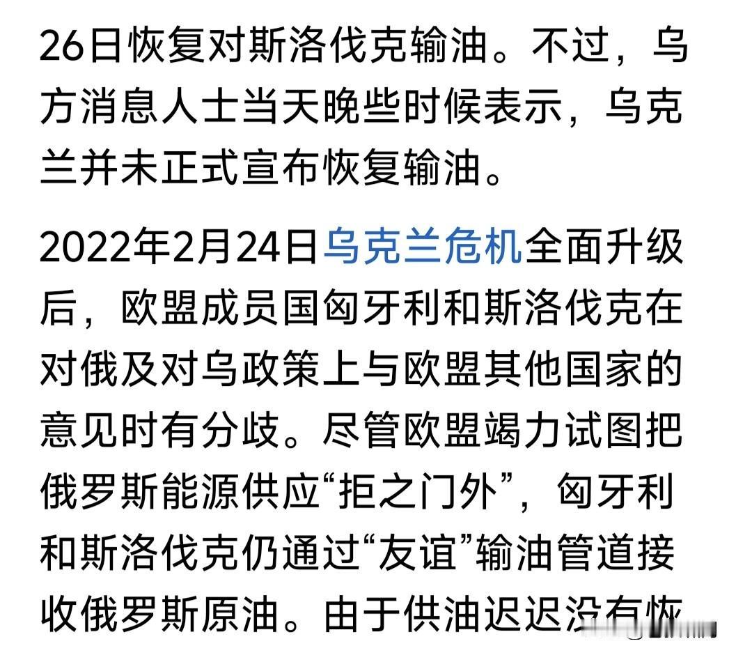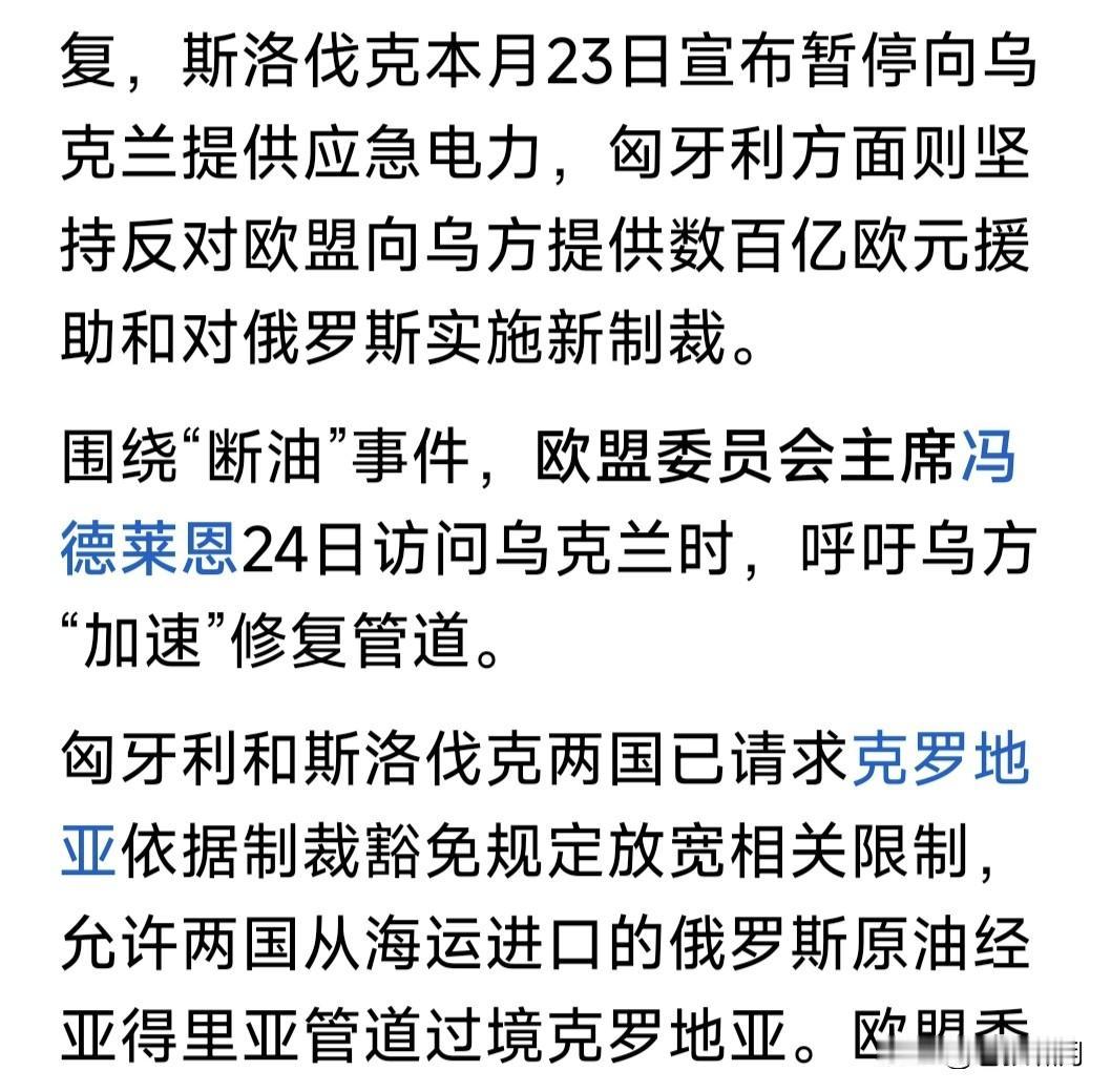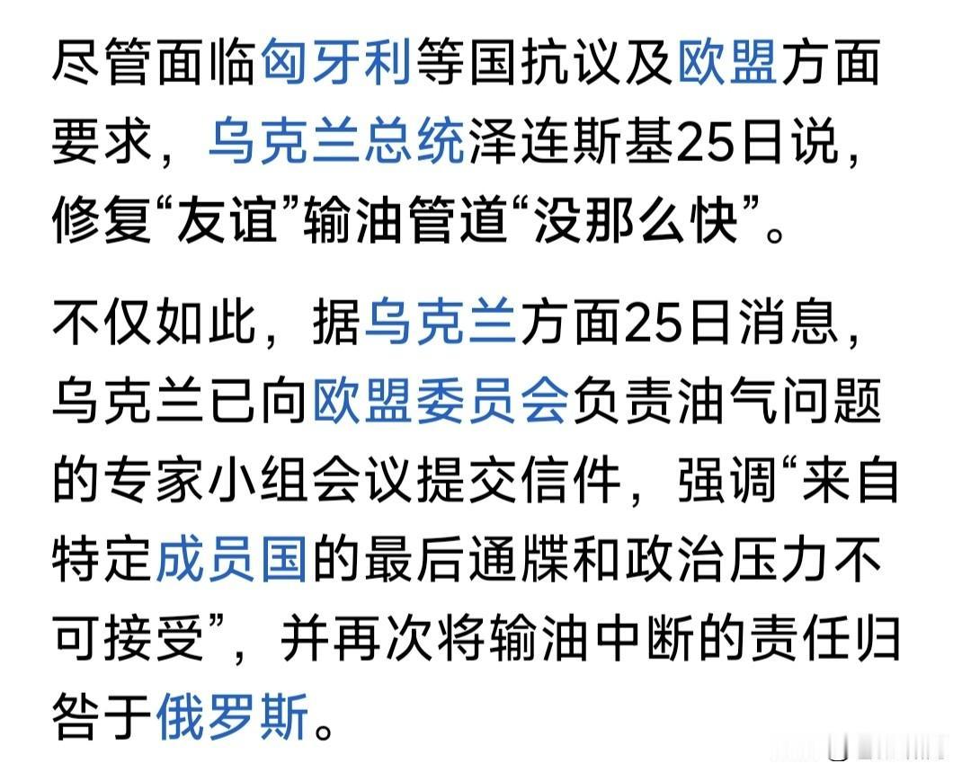 为保家卫国胜利,泽连斯基做出妥协!同意冯德莱恩请求,修复“友谊”输油管道,解除匈斯两国燃油困扰。 “友谊”输油管道,是俄经乌境,输往中东欧重要油路,捷克匈牙利斯洛伐克是最大受益者。1月底爆炸损坏,导致管道中断。捷匈斯顿时陷油荒。 捷克此前响应欧盟,2027切断“俄油”计划,已获新“供油”渠道,因此没反应。但匈斯没解决此问题,顿时陷困境。欧尔班与菲佐反应强烈,要停止对乌电力供应,并将阻止乌加入欧盟。 冯德莱恩24日访问基辅,建议小泽修复“友谊”输油管道,消解匈斯两国心头之火,缓解欧盟内部矛盾,为随后欧盟持续援乌,加入欧盟铺平道路。多重压力面前,小泽妥协同意修复,但26日无法完工,可能延后几天时间。 “友谊”管道到底谁炸的?欧尔班与菲佐说是乌克兰,报复“阻止欧盟援乌资金”之仇!小泽说是俄导弹故意射偏,导致管道中断,借此挑拨欧盟内部矛盾,让匈斯两国阻挡援乌计划通过。 小泽为何一改此前强硬,同意修复“友谊”输油管道?说到底是为缓解匈斯矛盾,使欧盟2026年900亿援乌资金通过,也为随后加入欧盟铺路! 强龙不压地头蛇!欧尔班与菲佐就是地头蛇,有他们掣肘对乌不利。识时务者为俊杰!还是先修复管道,缓解当前矛盾,先争取保家卫国胜利啊! …………
