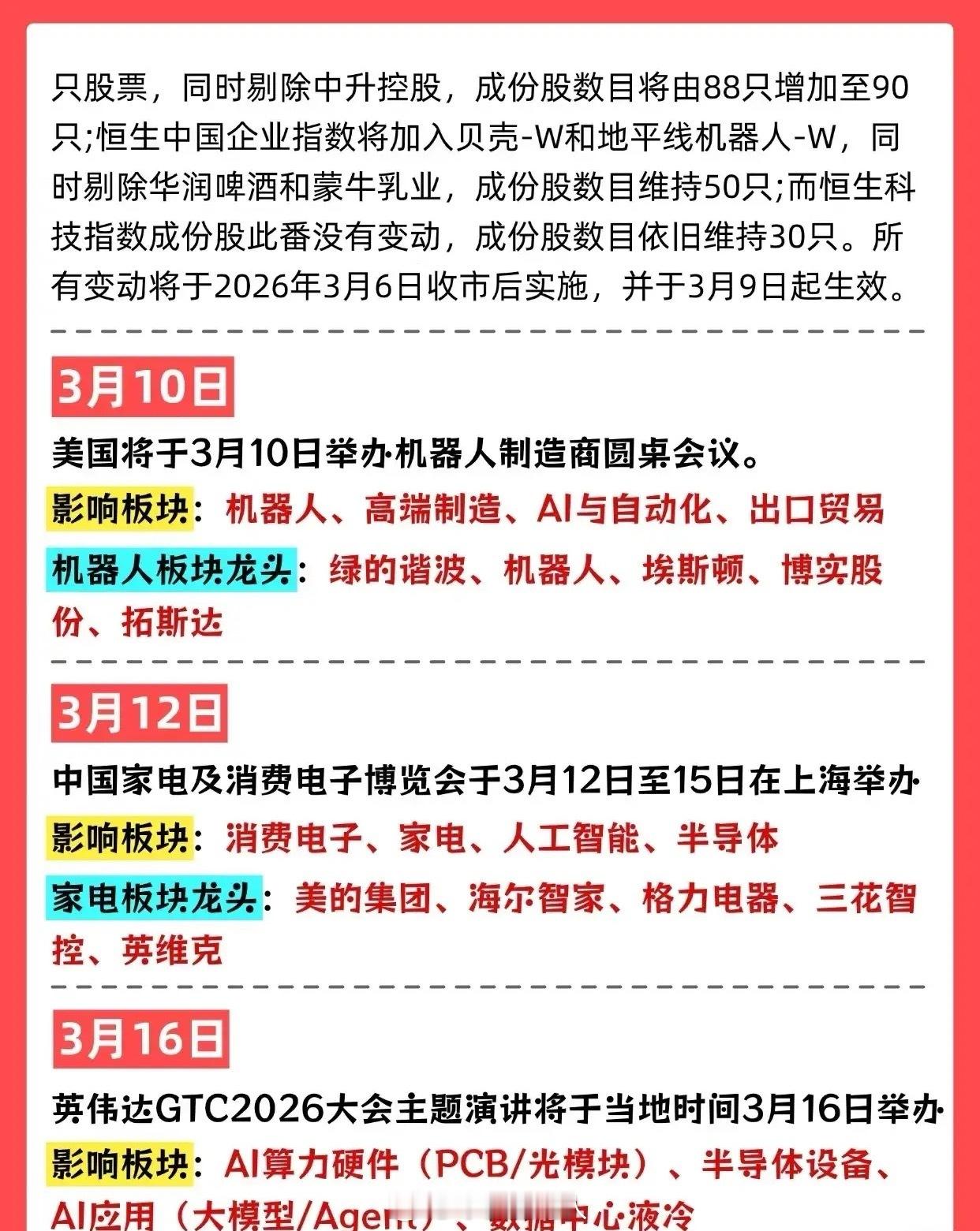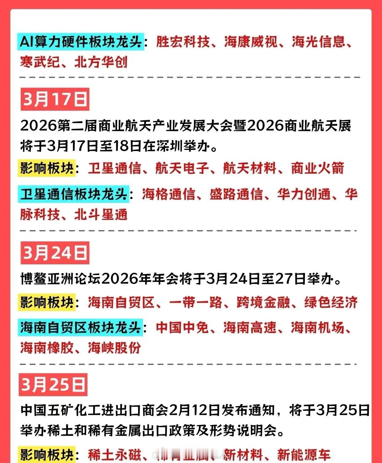 3. 月末看产业:半导体展、开发者大会、商业航天大会密集落地,聚焦国产替代与技术落地,叠加两会政策红利,科技主线将贯穿全月。⚠️ 风险提示:科技板块受海外政策、行业竞争、技术迭代风险影响较大,以上内容仅为事件梳理,不构成投资建议。