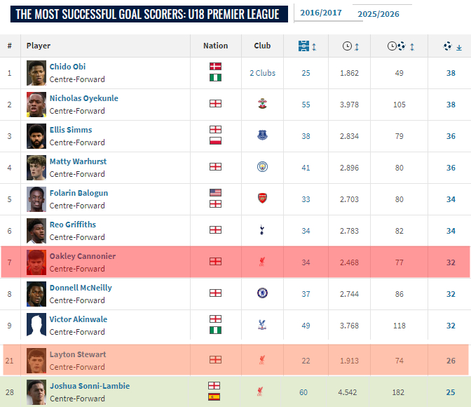 利物浦还是给了他一份三年合同,17岁时能拿到的最长年限。与此同时,他在U18从10号改打9号,并在2021-22赛季突破40球大关。