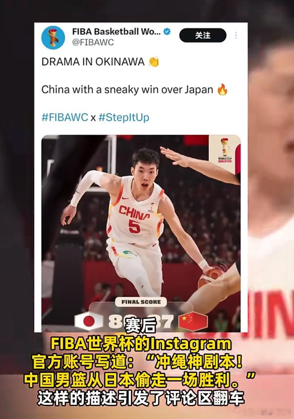 昨日FIBA世界杯官方社媒用“China with a sneaky win over Japan”(中国男篮从日本偷走一场胜利)发布战报。“sneaky”一词自带“鬼祟、不光彩”贬义,否定了中国男篮拼搏成果。