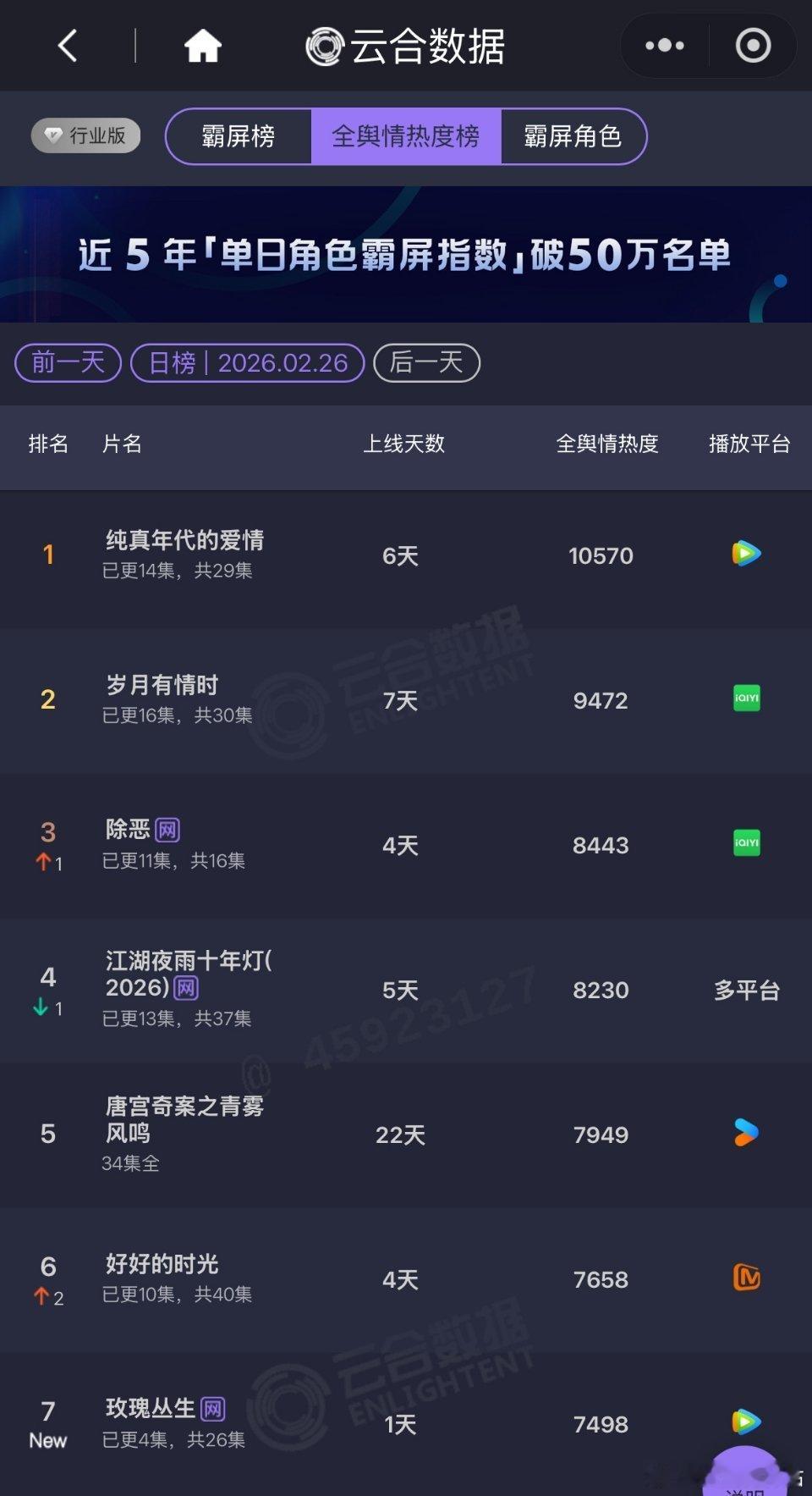陈飞宇新剧云合双榜登顶 《纯真年代的爱情》拿下云合双榜第一,开播后走势很稳,观众的喜爱与支持是最好底气。