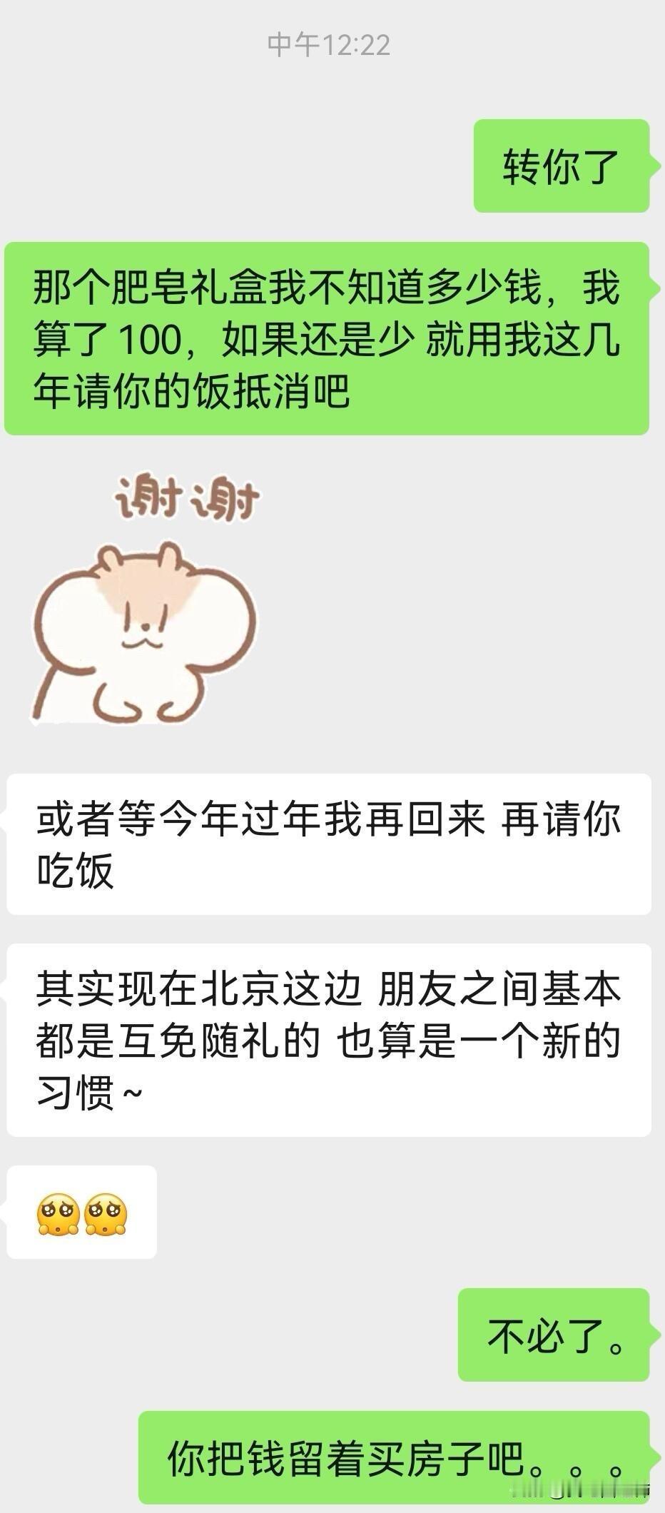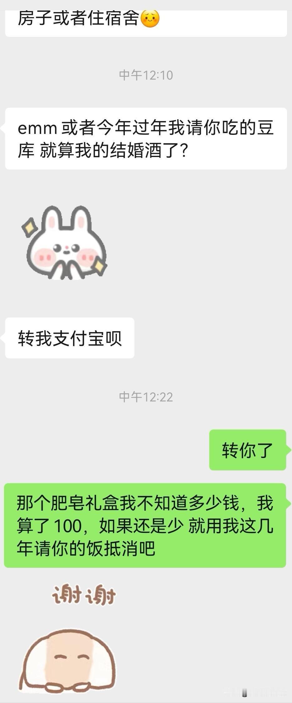 我结婚在去年过年期间 本地电瓶车距离 她随礼200和一个香皂礼盒 她也在去年中博士毕业留在北京了 计划是今年结婚 今年过年回来她请我吃了一顿 说是庆祝她博士毕业终于有正式工资可以请我吃一顿了 结果才回去没几天 今天突然问我要回礼金 还要用过年那顿饭抵酒席 我突然感觉这段感情很不值 好像一直是我单方面付出