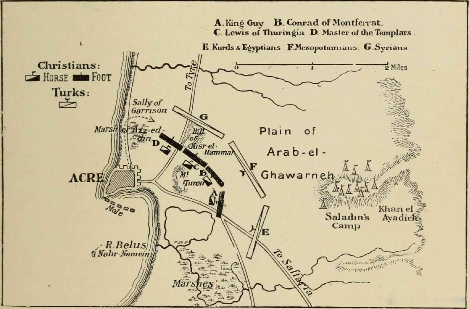 西洋历史文化鱼缸 历史知识 1189-1190年期间,第三次十字军三大国主力抵达前,居伊领衔的十字军围攻阿卡并与前来援救的萨拉丁对峙的态势图,来自英国历史学家、考古学家Stanley Lane-Poole(1854-1931)1898年的著作《萨拉丁与耶路撒冷王国的陷落》(Saladin and the fall of the Kingdom of Jerusalem) 。阿卡的双重包围战在战争史上也是一个奇观。如图所示,在三大天主教君主抵达圣地前,居伊于1189年夏天率先率领少量部队(得到了比萨舰队支援)对阿卡发动了奇袭,然而萨拉丁及时支援,双方各自在城外安营扎寨,形成了对峙。由于阿卡临海而十字军掌握制海权,尽管萨拉丁一度拥有兵力优势,但仍难以下决心将对手赶下海。居伊的十字军在阿卡城和东边的萨拉丁营地之间扎营,除了居伊的嫡系部队和两大骑士团以外,还包括以图林根伯爵为代表的先期抵达的欧洲十字军,以及从提尔赶来的康拉德。而萨拉丁的部队则集结了来自埃及、叙利亚和两河流域的力量。双方都沿着阿卡城外的贝吕什河驻扎,这条小河也会对未来的战局产生重大影响。
