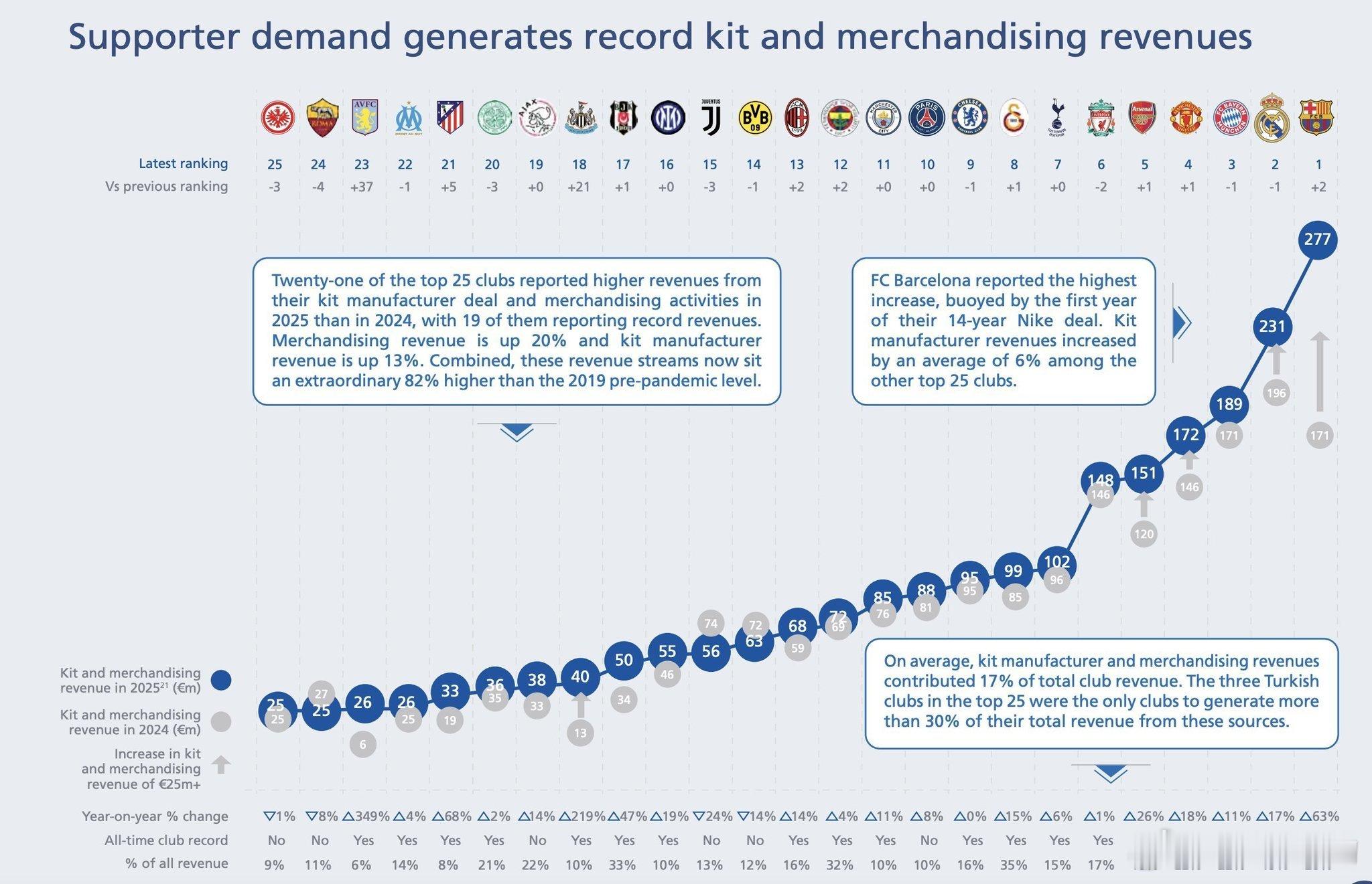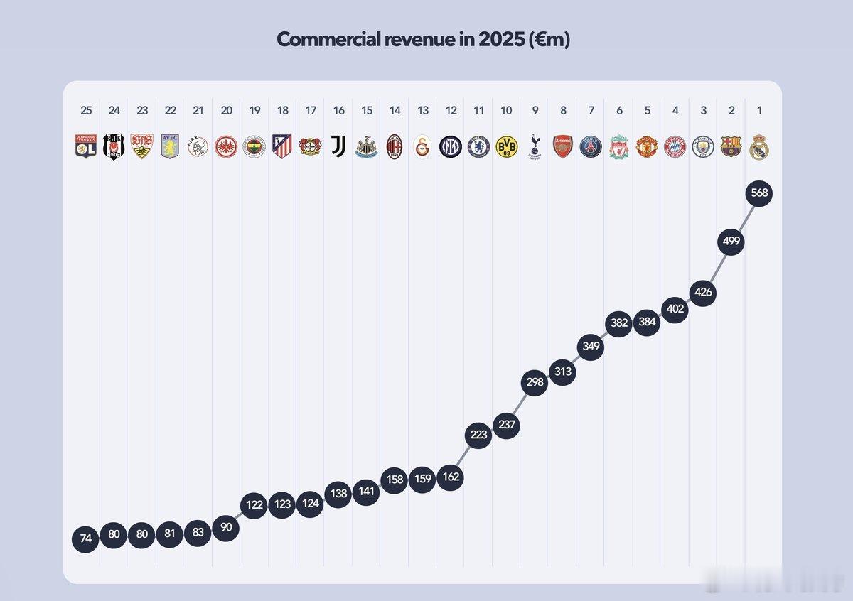 欧足联2025年财务报告显示,拜仁慕尼黑在球衣和周边商品收入方面排名第三,商业收入排名第四,但在电视转播收入方面仅排名第19,这还是往上蹿升了8位。英超在转播收入的优势实在是太大了,拜仁已经是非英超球队第二了……