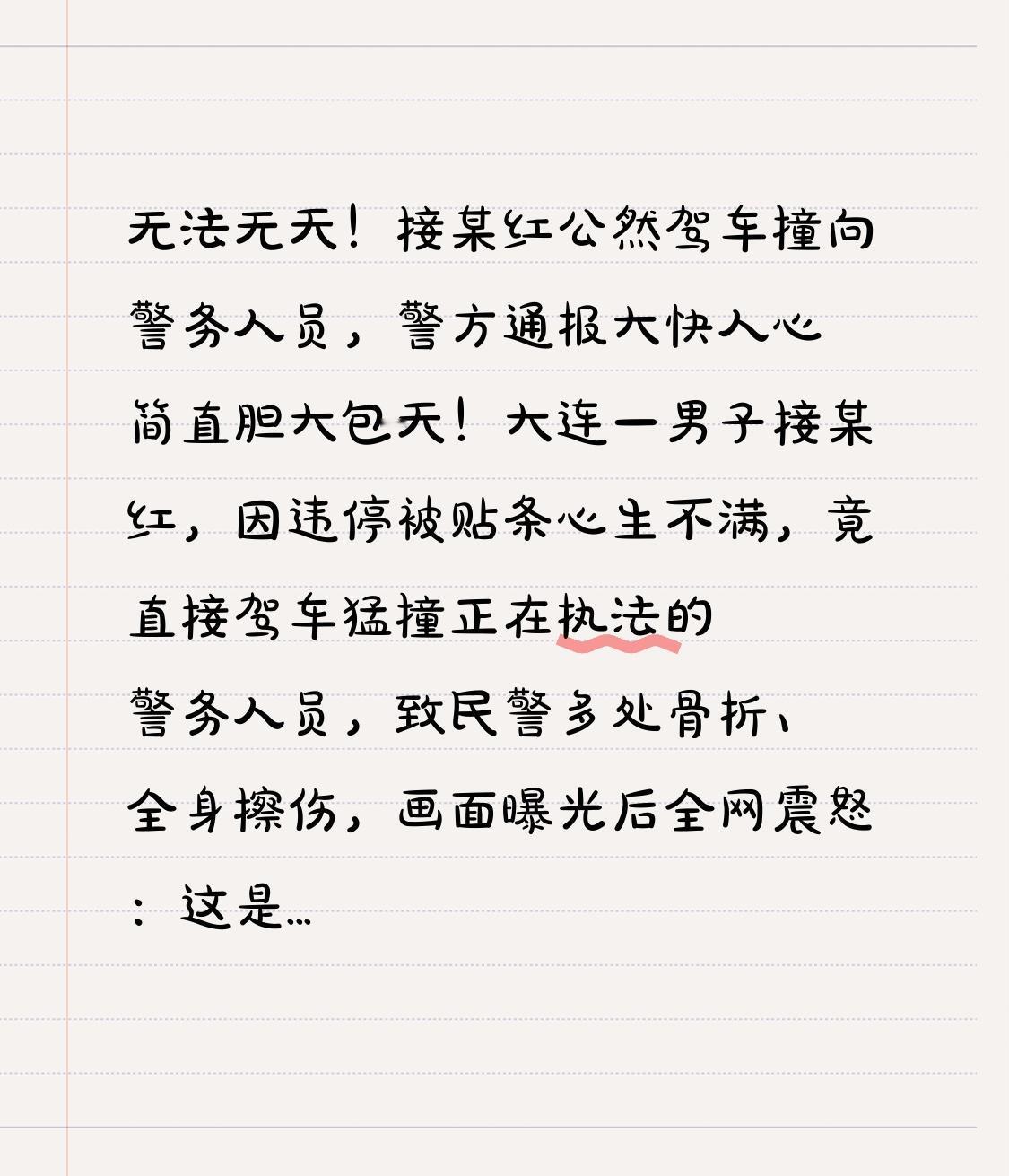 无法无天!接某红公然驾车撞向警务人员,警方通报大快人心 简直胆大包天!大连一男子接某红,因违停被贴条心生不满,竟直接驾车猛撞正在执法的警务人员,致民警多处骨折、全身擦伤,画面曝光后全网震怒:这是拿生命挑衅法律底线! 事情起因再简单不过:接某红违规停车,交警依法贴单处罚。这本是最普通的交通执法,谁料接某红返回后,当场发飙要求撤销罚单。民警耐心解释法规,劝他理性维权,可他态度嚣张、不听劝阻,怒火上头后竟做出疯狂举动——开车径直冲向执勤民警! 猝不及防的民警被狠狠撞倒在地,痛苦倒地,而接某红的行为,已经不是冲动闹事,而是赤裸裸的暴力袭警、公然践踏执法权威!很多人看完视频气得发抖:民警守护道路秩序,却要承受这种无妄之灾,换谁不心疼? 转折来了!法律不会放过任何一个暴徒。增援警力迅速赶到,当场将接某红控制。面对铁证,他对袭警犯罪事实供认不讳,目前因涉嫌妨害公务罪被依法刑拘,等待他的将是牢狱之灾。警方同时启动维权程序,全力救治受伤民警,坚决维护执法者的安全与尊严。 这起事件给所有人敲响警钟:执法权威不容挑衅,法律底线不可触碰。对执法者动手,不是“有脾气”,而是犯罪;拿车辆当凶器,不是“泄愤”,是自毁前程。有异议可以申诉,不服气可以复议,绝不能用暴力解决问题。 哪有什么岁月静好,不过是有人在替我们守护秩序。民警寒风中执勤、烈日下疏导,换来的是道路畅通与百姓平安。尊重执法者,就是尊重我们自己的安全;敬畏法律,才是做人最基本的底线。 必须严惩袭警恶行,还受伤民警一个公道!也奉劝所有人:克制冲动、遵守规则,别让一时糊涂,毁掉自己的一生。为执法者撑腰,为法治点赞,正义永远不会缺席!