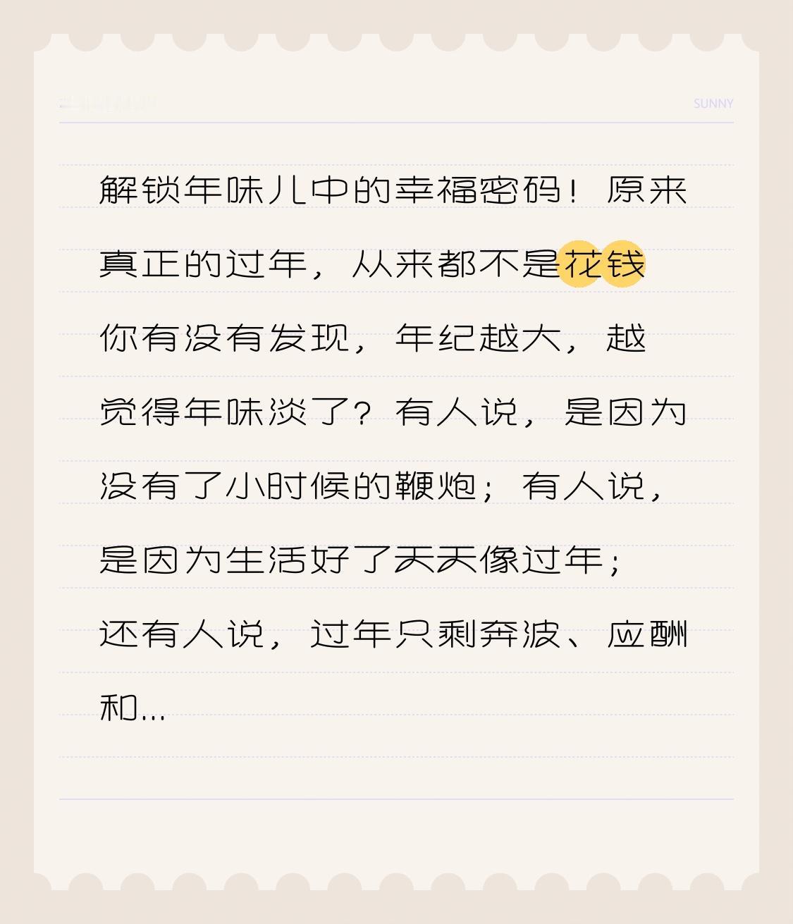 解锁年味儿中的幸福密码!原来真正的过年,从来都不是花钱 你有没有发现,年纪越大,越觉得年味淡了? 有人说,是因为没有了小时候的鞭炮;有人说,是因为生活好了天天像过年;还有人说,过年只剩奔波、应酬和花钱。可当你静下心来才会懂,年味儿从来没变,变的是我们寻找幸福的方式。今天,一起解锁藏在年味儿里的幸福密码! 小时候,年味是新衣服、压岁钱、满桌好吃的,是盼了一整年的热闹。我们以为,年味要靠买、靠堆、靠排场,于是长大以后,拼命买年货、送大礼、吃大餐,把过年过成了“消费节”,钱花了不少,心里却空落落的。 转折点来了! 真正的年味,根本不在昂贵的礼物里,不在奢华的饭局上,更不在攀比的红包中。它藏在妈妈蒸的一笼馒头里,藏在爸爸贴春联的背影里,藏在一家人围坐看电视的笑声里,藏在一句简单的“回来就好”里。 幸福密码其实很简单: 是厨房飘出的饭菜香,是全家一起大扫除的烟火气,是晚辈给长辈磕个头、说句吉祥话,是久别重逢的拥抱,是不用赶时间、不用看手机的陪伴。 我们总在向外寻找年味,却忘了最珍贵的幸福,一直就在身边。 不是年味变淡了,是我们忘了,过年的本质,是团圆,是安心,是回家,是爱。 当你放下攀比、放下焦虑、放下疲惫,陪家人唠唠嗑,吃一顿家常菜,拍一张全家福,你会突然发现:这才是过年最该有的样子。 愿新的一年,我们都能找回最简单的年味,守住最真实的幸福。 家人闲坐,灯火可亲,平安健康,便是人间最好的年。 解锁属于你的幸福密码,愿你年年欢喜,岁岁安康!
