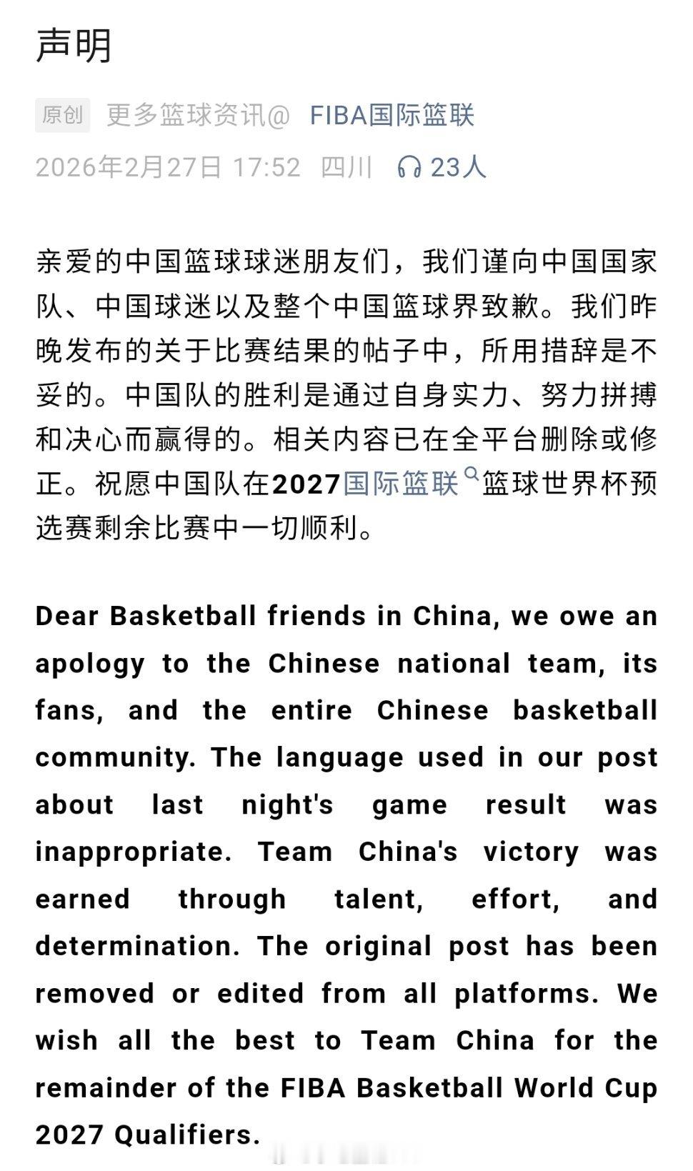 FIBA国际篮联官方发布声明:“亲爱的中国篮球球迷朋友们,我们谨向中国国家队、中国球迷以及整个中国篮球界致歉。我们昨晚发布的关于比赛结果的帖子中,所用措辞是不妥的。中国队的胜利是通过自身实力、努力拼搏和决心而赢得的。相关内容已在全平台删除或修正。祝愿中国队在2027国际篮联篮球世界杯预选赛剩余比赛中一切顺利。”