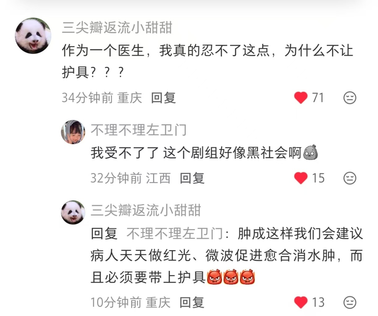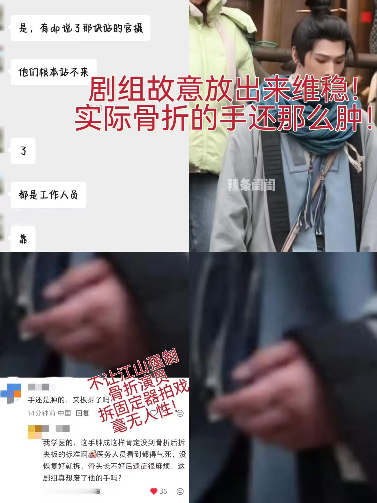 过来人表示之前脚踝受伤都要一直吊着,不然红肿特别难受。他这是骨折只会更严重,不应该把手抬起来才能更快愈合消肿吗?而你们逼着骨折的演员拆掉固定器拍戏,还要让手垂着,就是你们说的好好照顾吗?