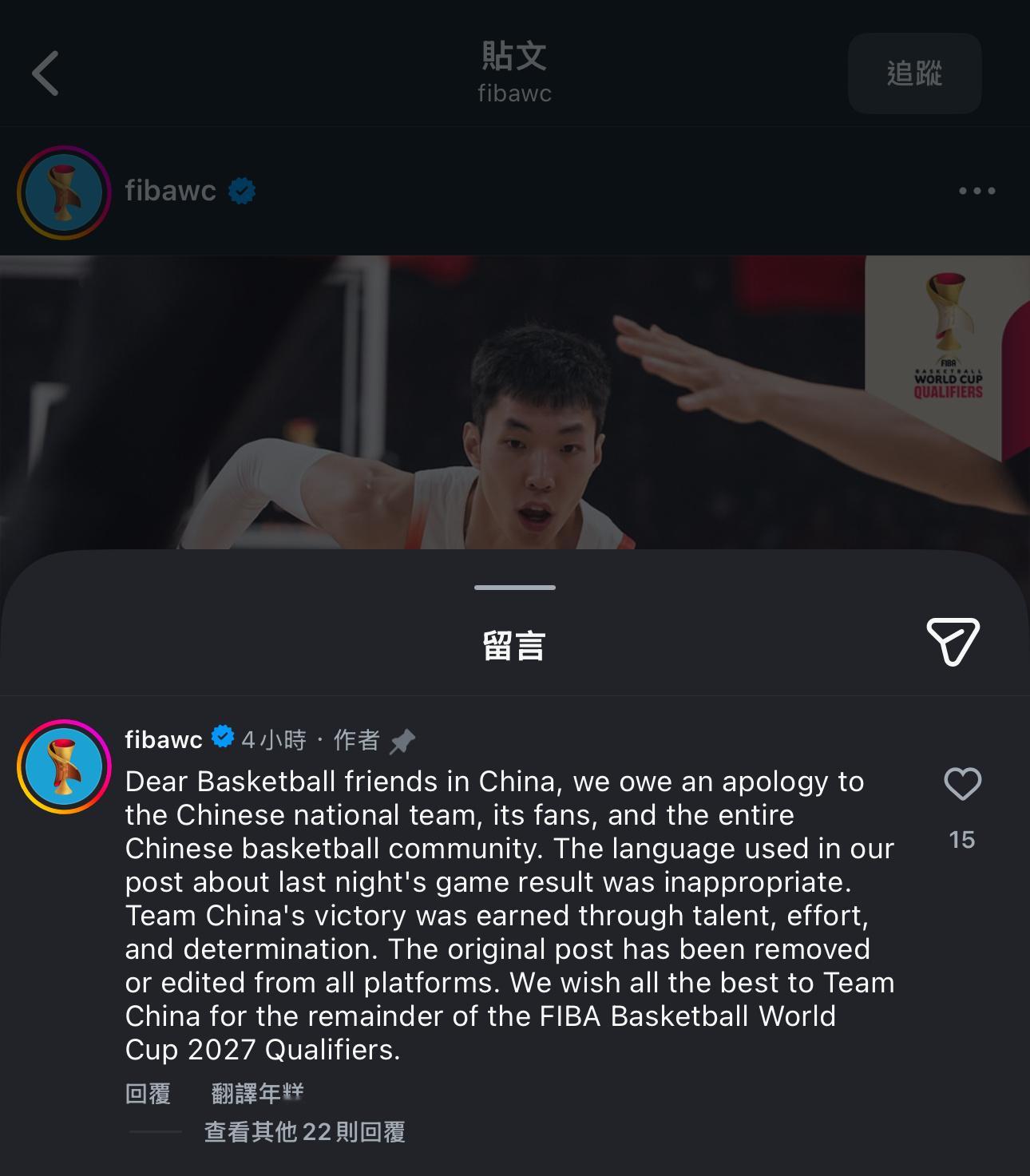 FIBA国际篮联向中国男篮致歉ins道歉放在了评论区,没玩国内专属道歉,有点诚意