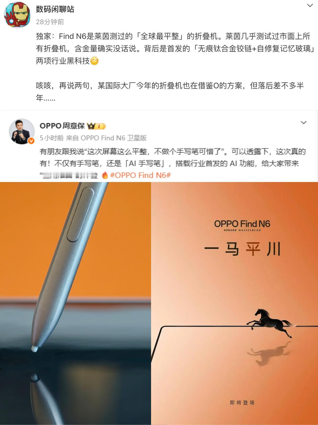 快劝劝我!手持OPPO Find N3想换机 Find N3也用了两年了,系统更新后用着很顺手,也一直没啥换机念头,但看了Find N6的爆料,我承认是有点馋了…… 而且最近看到RD观测的2026 W8国内手机市场份额,OPPO 直接拿下了19.1%,国内第一,更让我对Find N6有信心了! 目前Find N3在我看来唯一的遗憾,用久了中间一条痕,强迫症看着难受。而Find N6就是莱茵认证全球最平整折叠机,看广东台爆料的画面也确实平整,看得心痒痒了! 另外是没手写笔,想写写画画只能外接第三方笔,体验说实话一般。而且正是由于Find N6做到了无折痕,这回带上了AI手写笔,还有行业首发的AI功能,这支笔上有一个按键,话说会带来哪些新的交互体验?会继续保持关注看看到底什么玩法? Find N3拍照的话够用,但镜头也老了不够极致,Find N6看爆料是哈苏四摄,2亿像素镜头,丹霞原色镜头都有,可以弥补上N3的弱项,这也是个想换机的理由! 诚然Find N3确实是很香,但Find N6在我看来才是完整体,尤其是有痕到无痕、无笔到有笔的进化。Find N5忍住了没换,但Find N6的话感觉会换忍不住换掉!据说Find N6可能要涨价2000左右,虽然贵了,但个人认为,接下来两年内Find N6都会是最有性价比旗舰折叠屏手机,因为内存涨价越早发就越便宜,更何况是无折痕时代首发产品,早买早享受。而且感觉和苹果传闻2万的定价比起来,还是感觉挺香的啊? 数码大玩家 科技数码新鲜事儿 手机 OPPO 折叠屏 OPPOFindN6 手机分享 换手机 一起聊数码